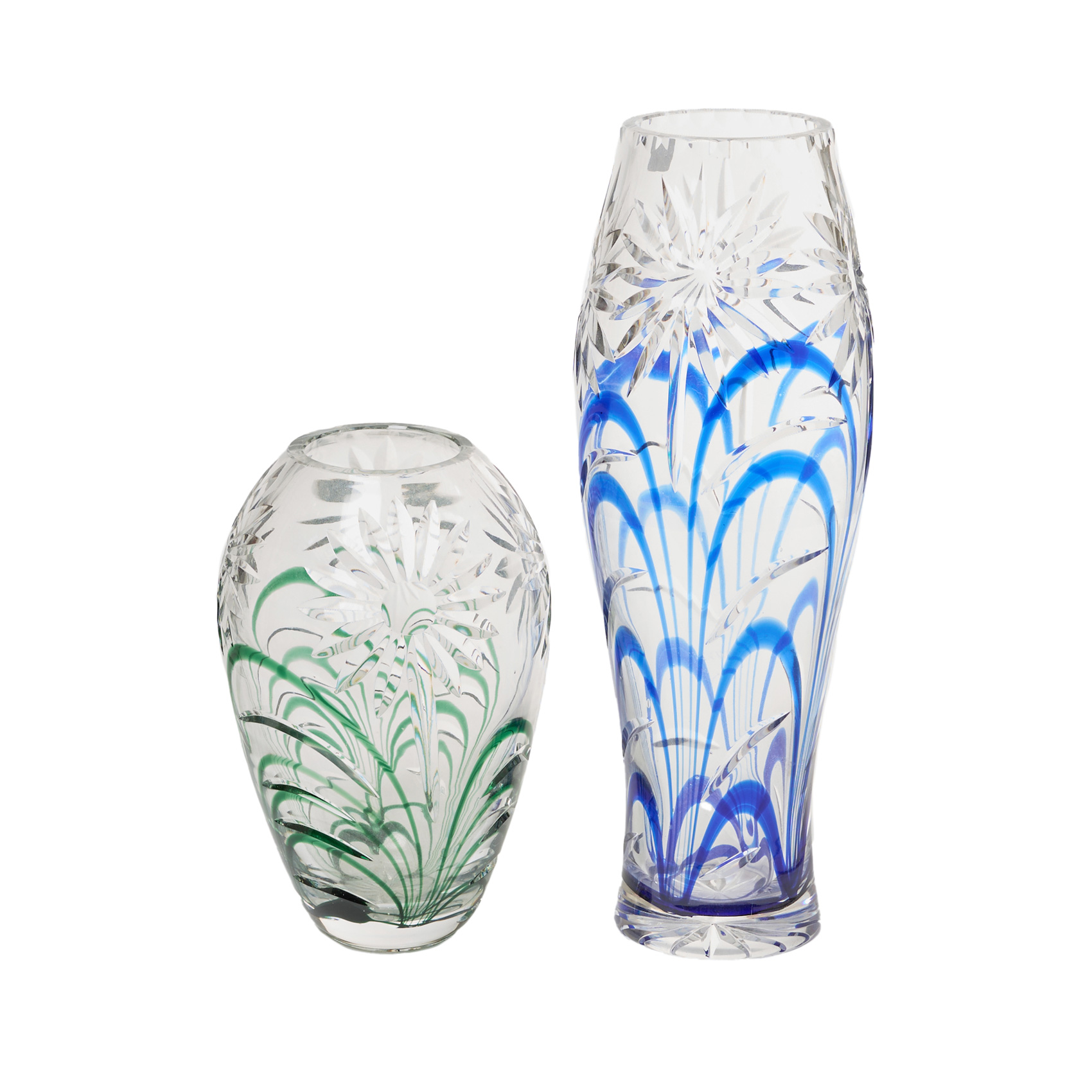 Pareja de jarrones en cristal tranlúcido y detalles en verde y azul con motivos florales tallados, s.XX.