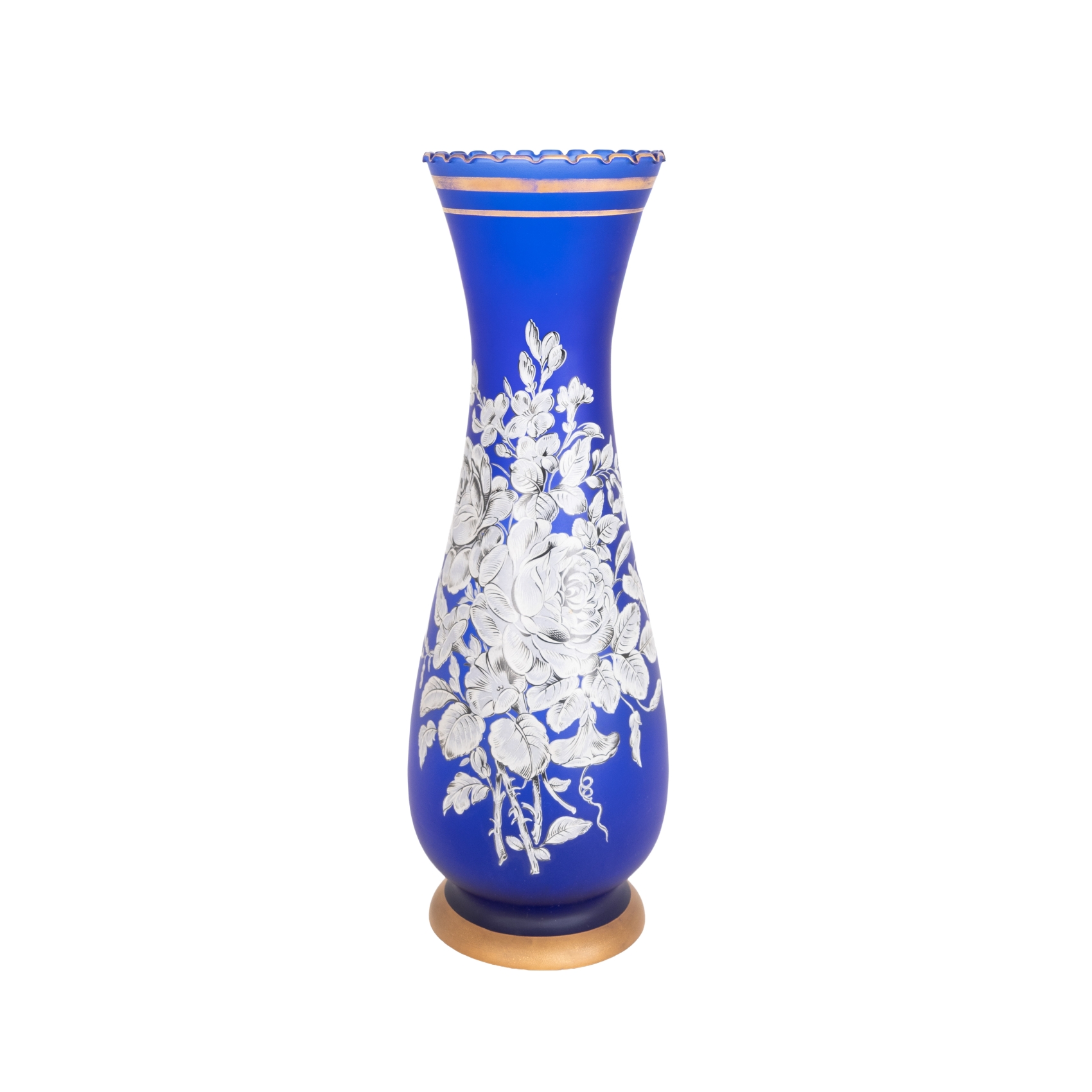 Jarrón en cristal de tonalidad azul mateado con decoración de ramillete de flores, s.XX.