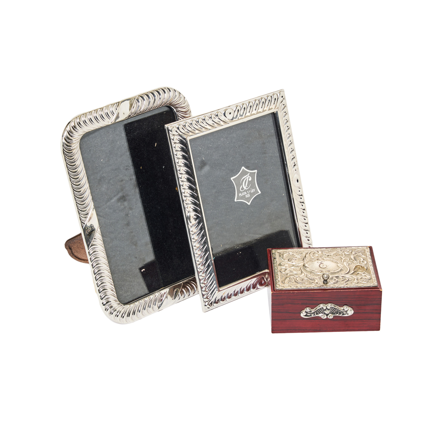 Lote de dos marcos en plata española punzonada y cajita en madera con decoración en plata de motivos vegetales, s.XX.