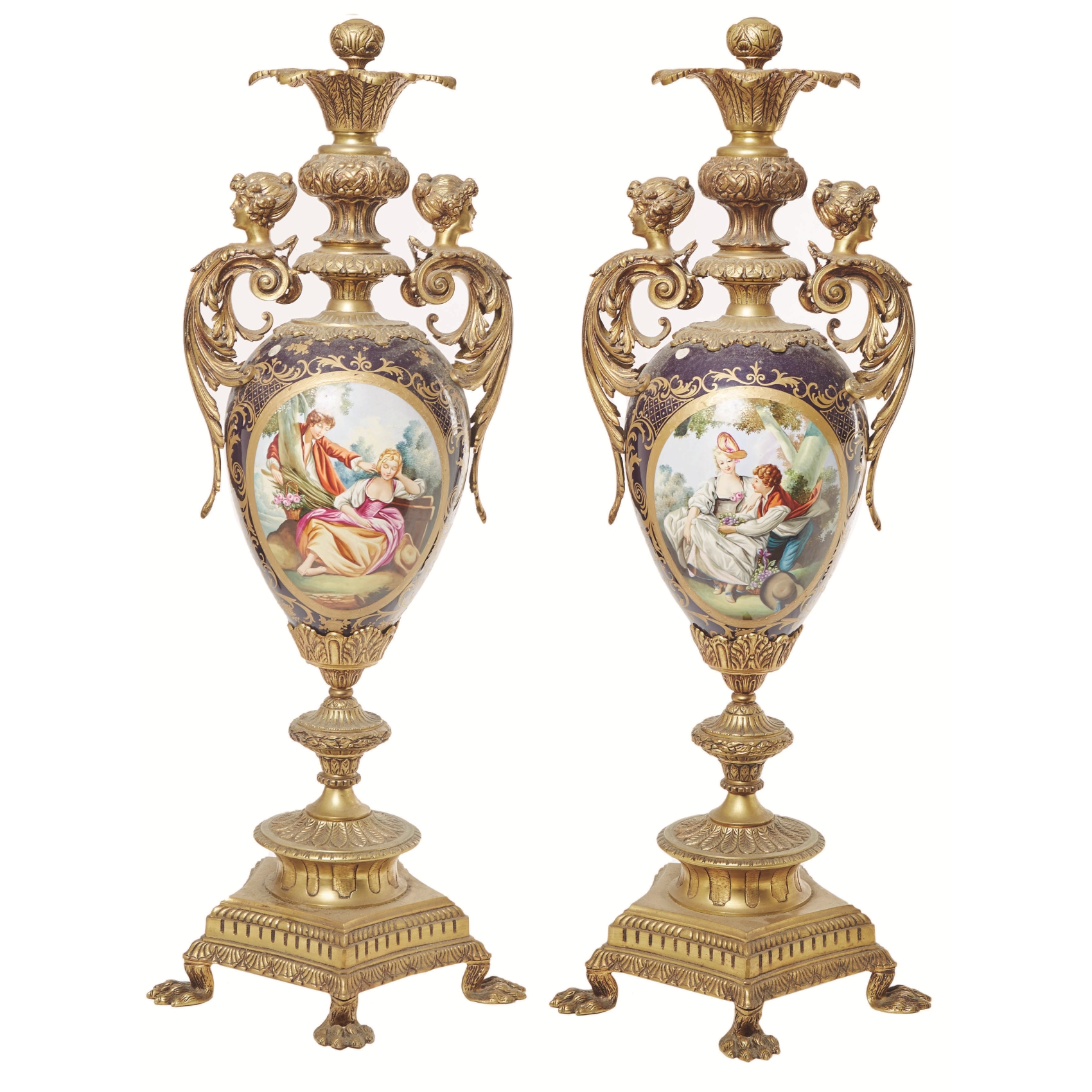 Gran pareja de jarrones en porcelana francesa de estilo Sèvres con representación de escenas románticas esmaltadas en cartelas, s.XX. Montura en bronce dorado con decoración de bustos femeninos, roleos y acantos. Base pentagonal sobre patas en garra.