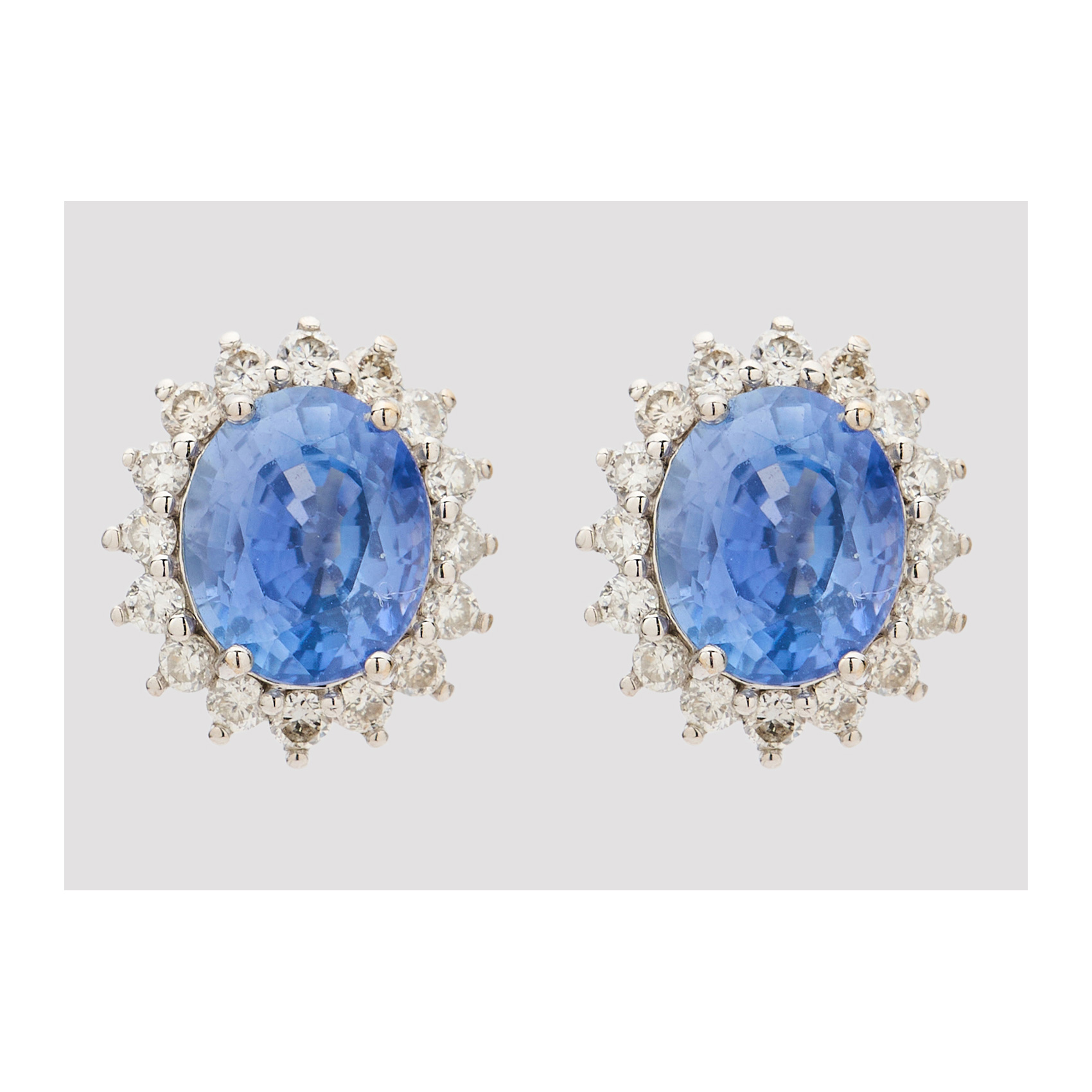 Pendientes rosetón en oro blanco con zafiro azul talla oval orlado por diamantes talla brillante.
