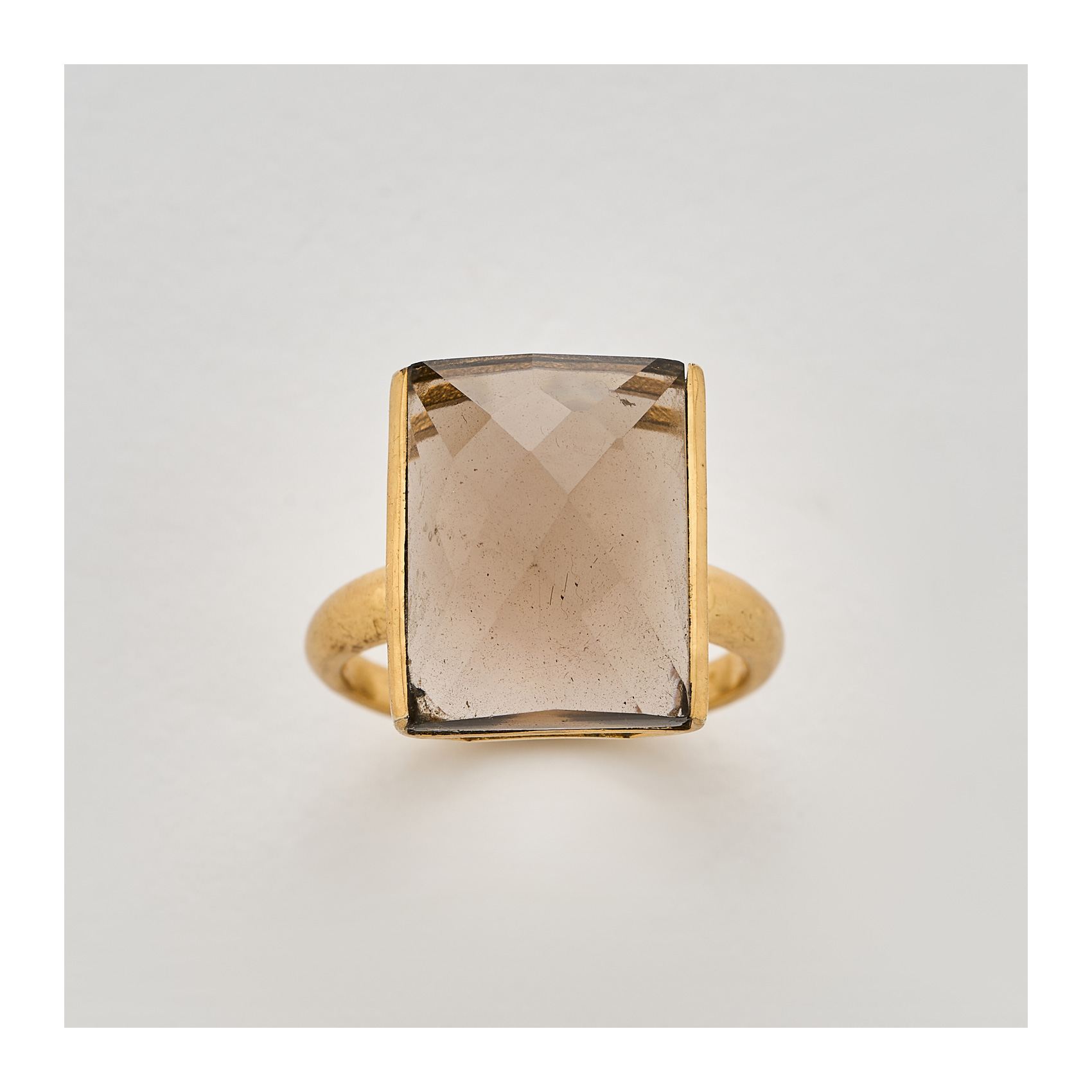 Sortija en plata vermeill con cabujón rectangular multifacetado de cuarzo fumé de 16 x 12 mm. engastado en carril.