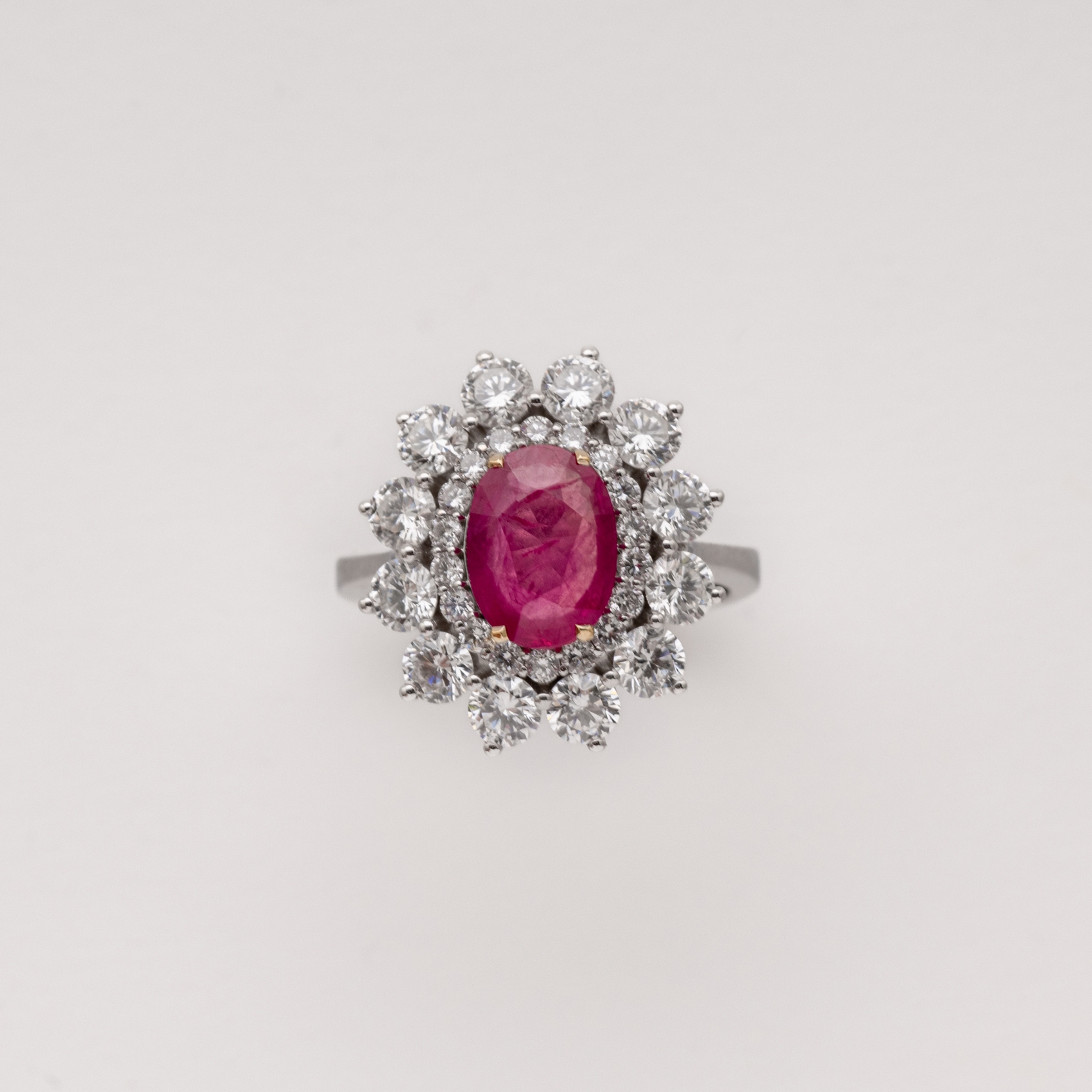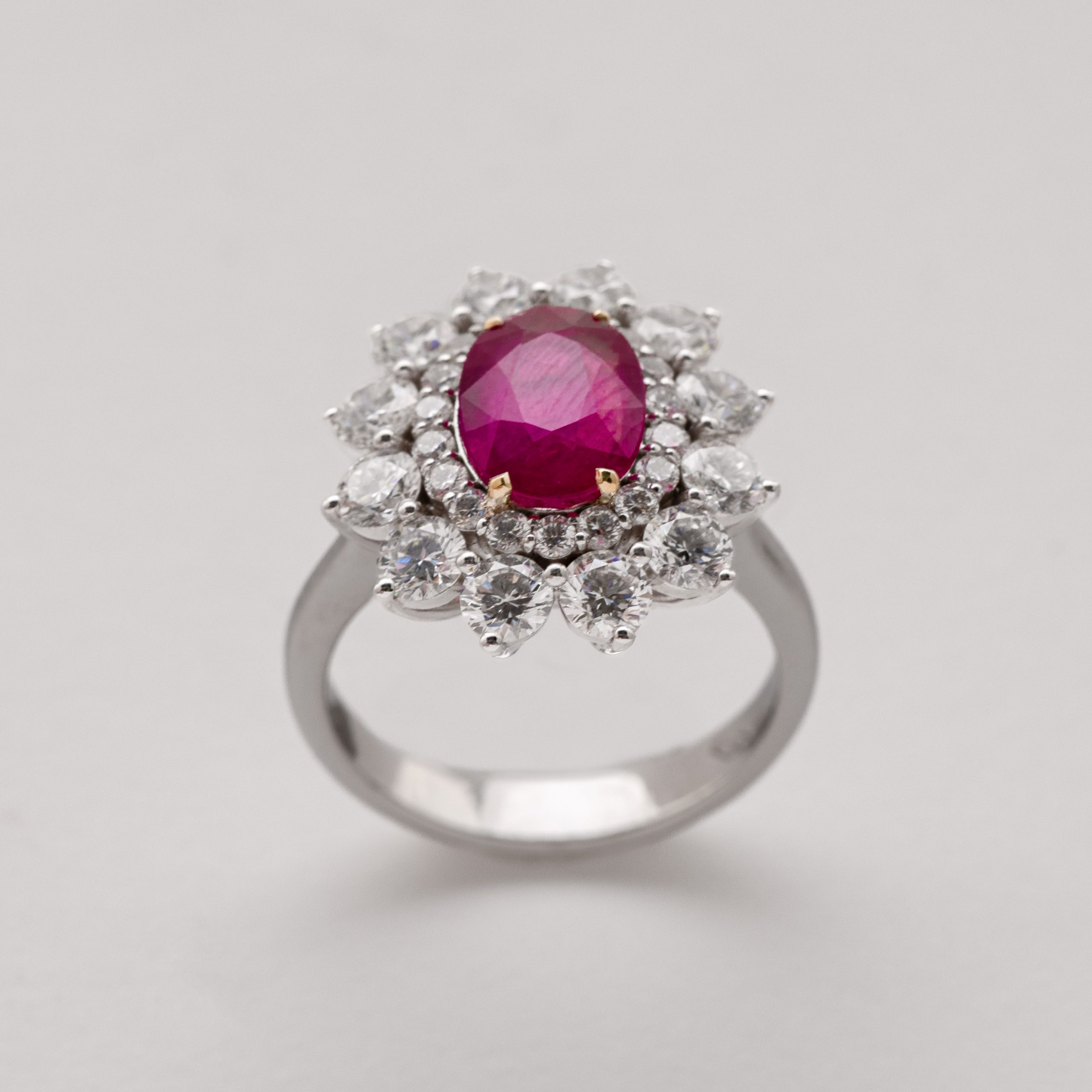 Sortija rosetón en oro blanco con rubí de Myanmar (Burma) talla oval orlado por diamantes talla brillante.