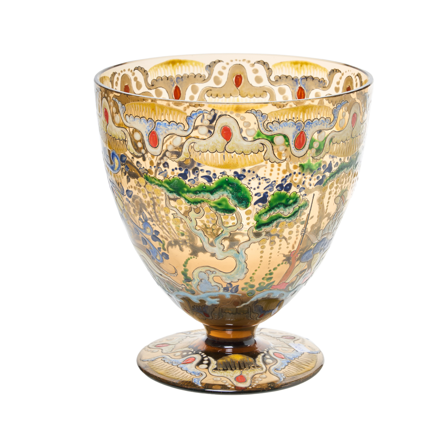 Jarrón en cristal de tonalidad ámbar con decoración esmaltada al fuego de motivos florales, vegetales y motivos cinegéticos.