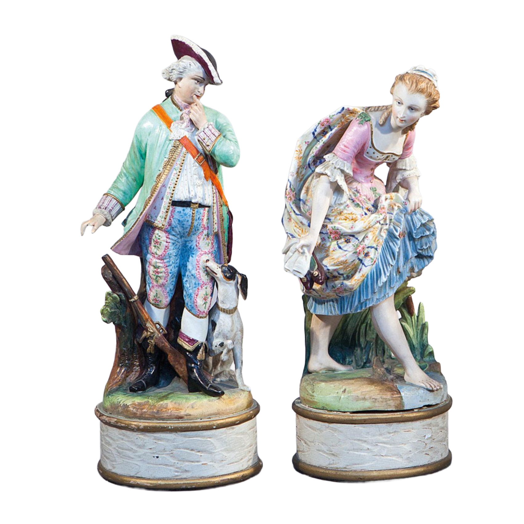 Cazador y dama. Pareja de esculturas en porcelana centroeuropea esmaltada sobre base en madera, s.XIX.