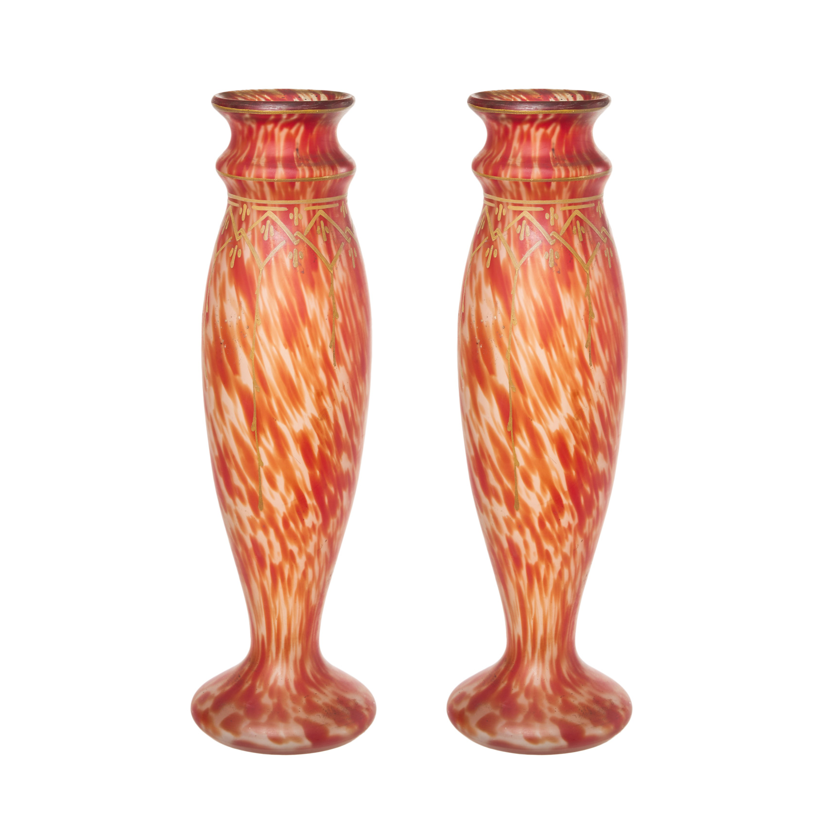 Pareja de jarrones franceses de tallo corto en «pâte de verre» de la serie 89000 de tonalidad naranja moteada con decoraciones al oro fino de guirnaldas de hojas. Firmados Leg. Bibliografía: Reproducidos en el libro «François-Théodore Legras, Verrerie artistique et populaire française» por Marie-Françoise & Jean-François Michel, Dominique & Jean Vitrat. Pág. 305-307. Edita DEUX-PONTS Plurimedia Productions, 2012.