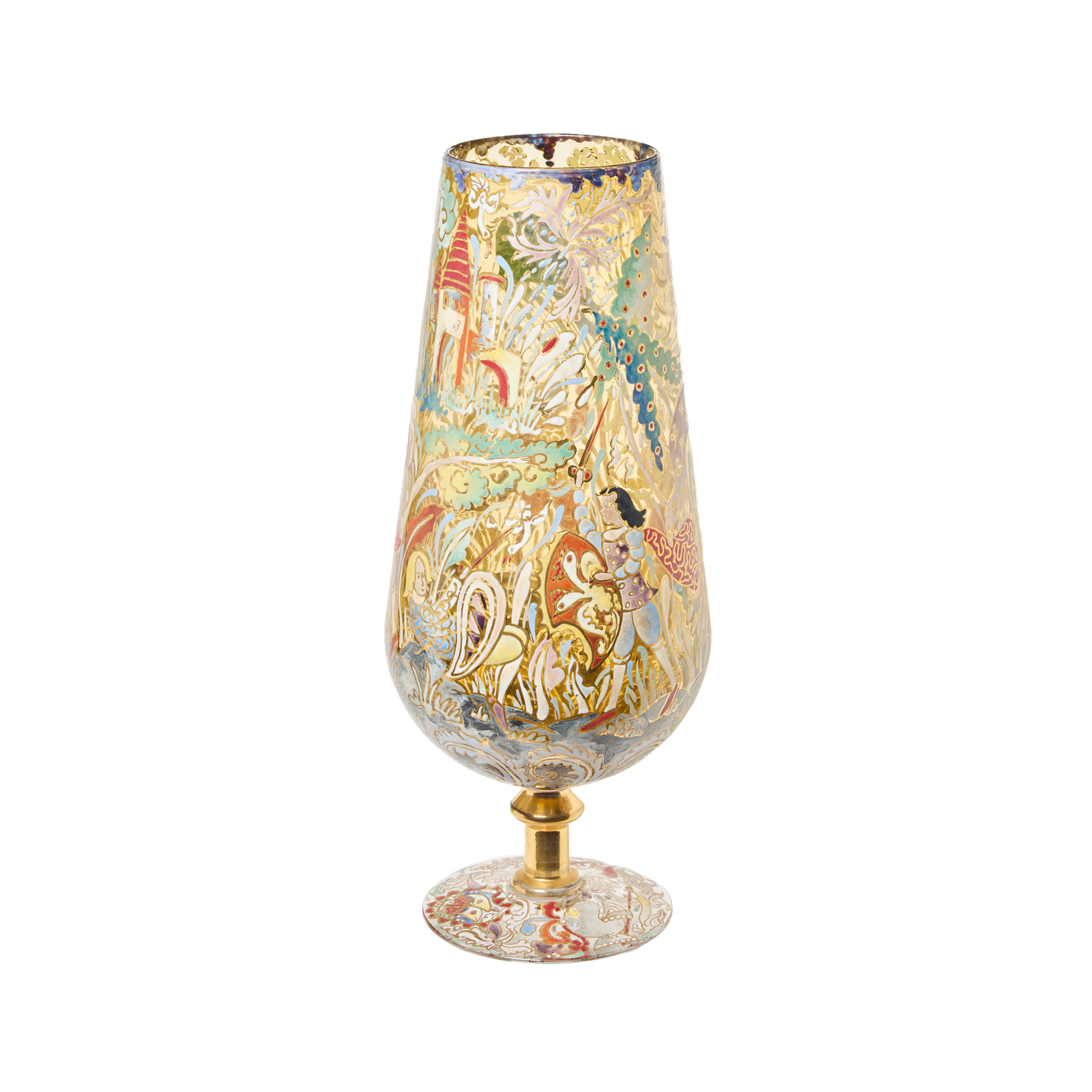 Jarrón en cristal de tonalidad ámbar con decoraciones esmaltadas al fuego de motivos caballerescos. Firmada.