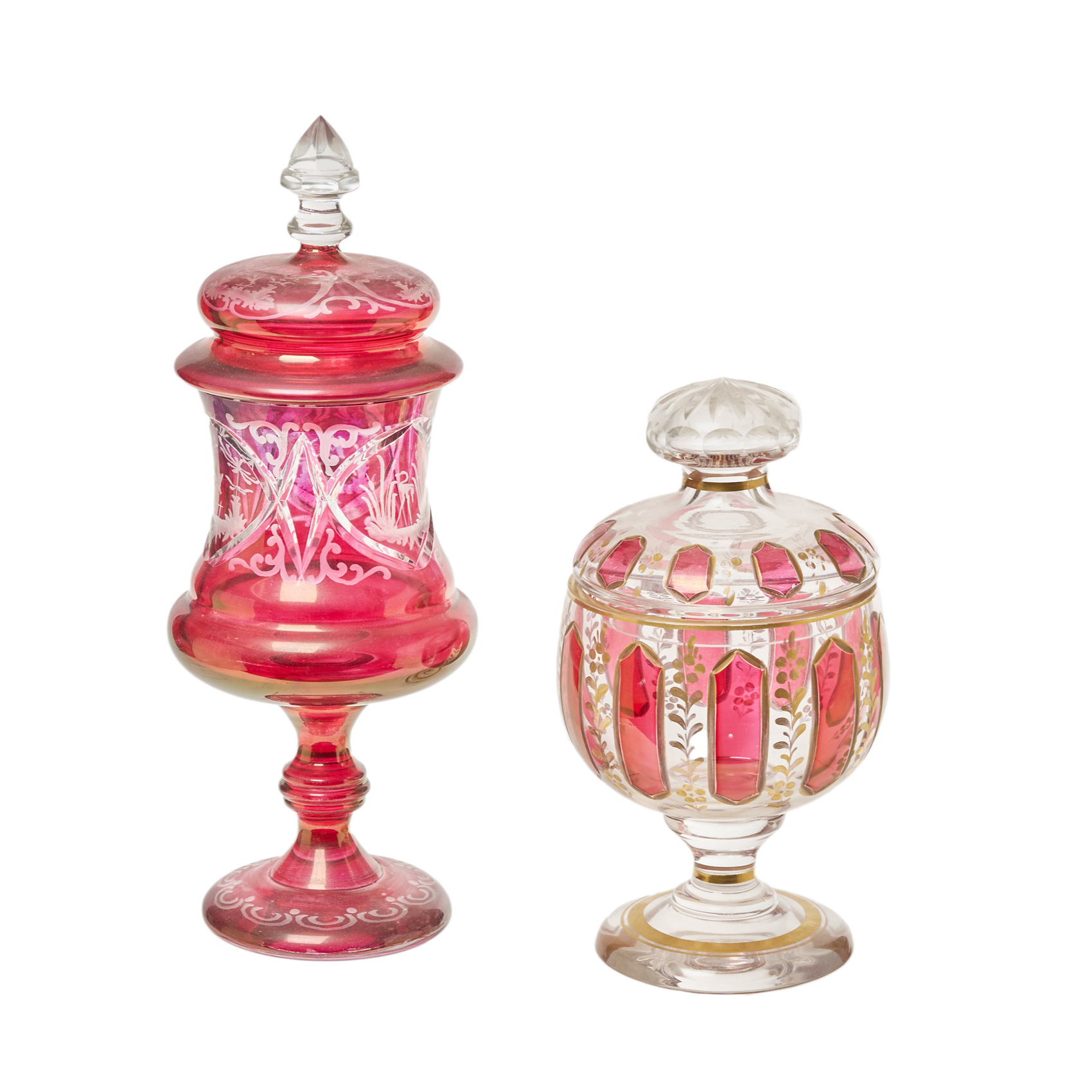 Lote de dos bomboneras en cristal de Bohemia tallado de tonalidades translúcidas y burdeos, ppios. de s.XX. Una de ellas con realces en dorado pintados a mano y otra con decoración grabada y paisajes en reservas.