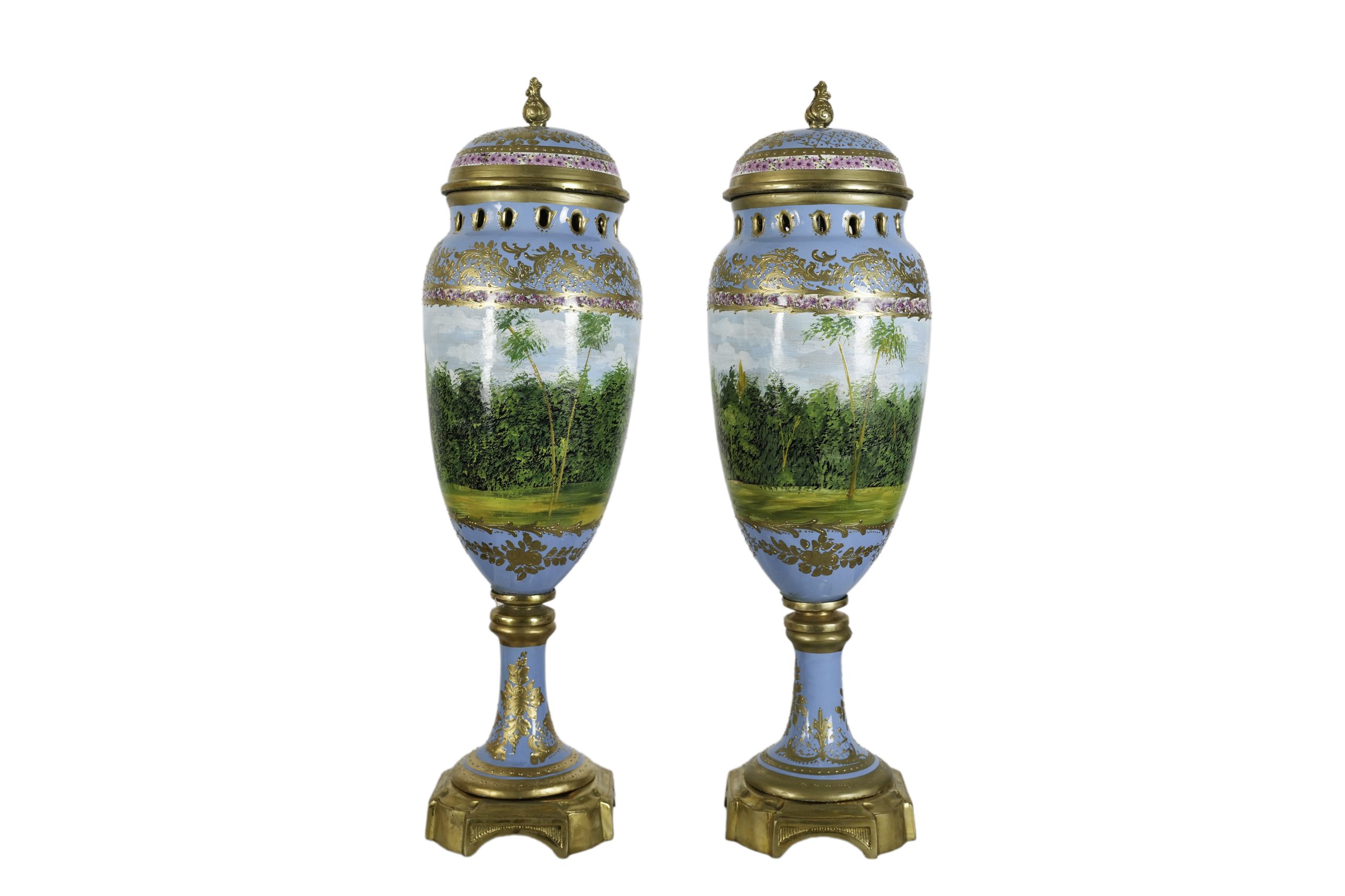 Pareja de jarrones franceses en porcelana esmaltada y dorada estilo Sèvres con escenas bucólicas en reserva, s.XX.
