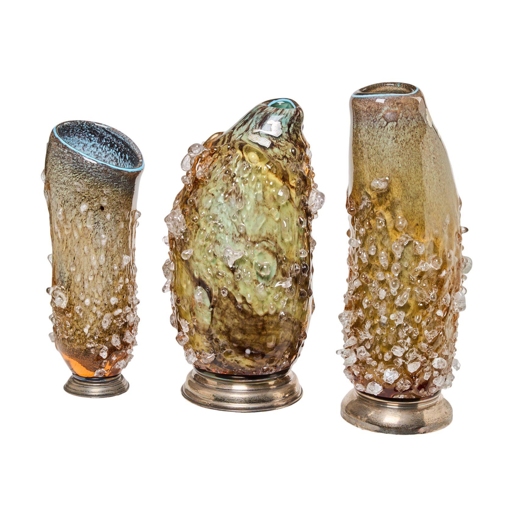 Lote de tres jarrones en cristal de Murano «sommerso» con efecto «bollicine» y pie en plata punzonada, s.XX.