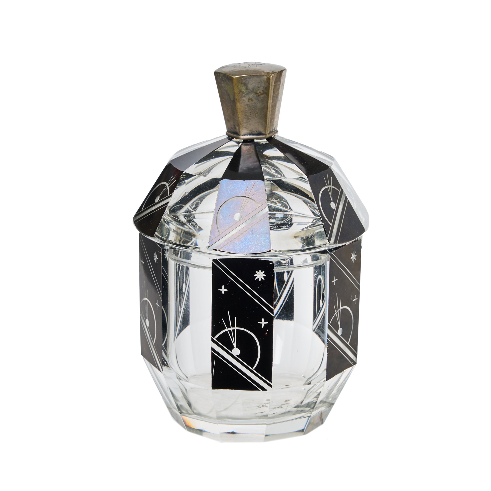 Bombonera Art Deco en cristal translúcido y negro con decoración geométrica incisa y boca en plata punzonada 915, ppios. del s.XX.