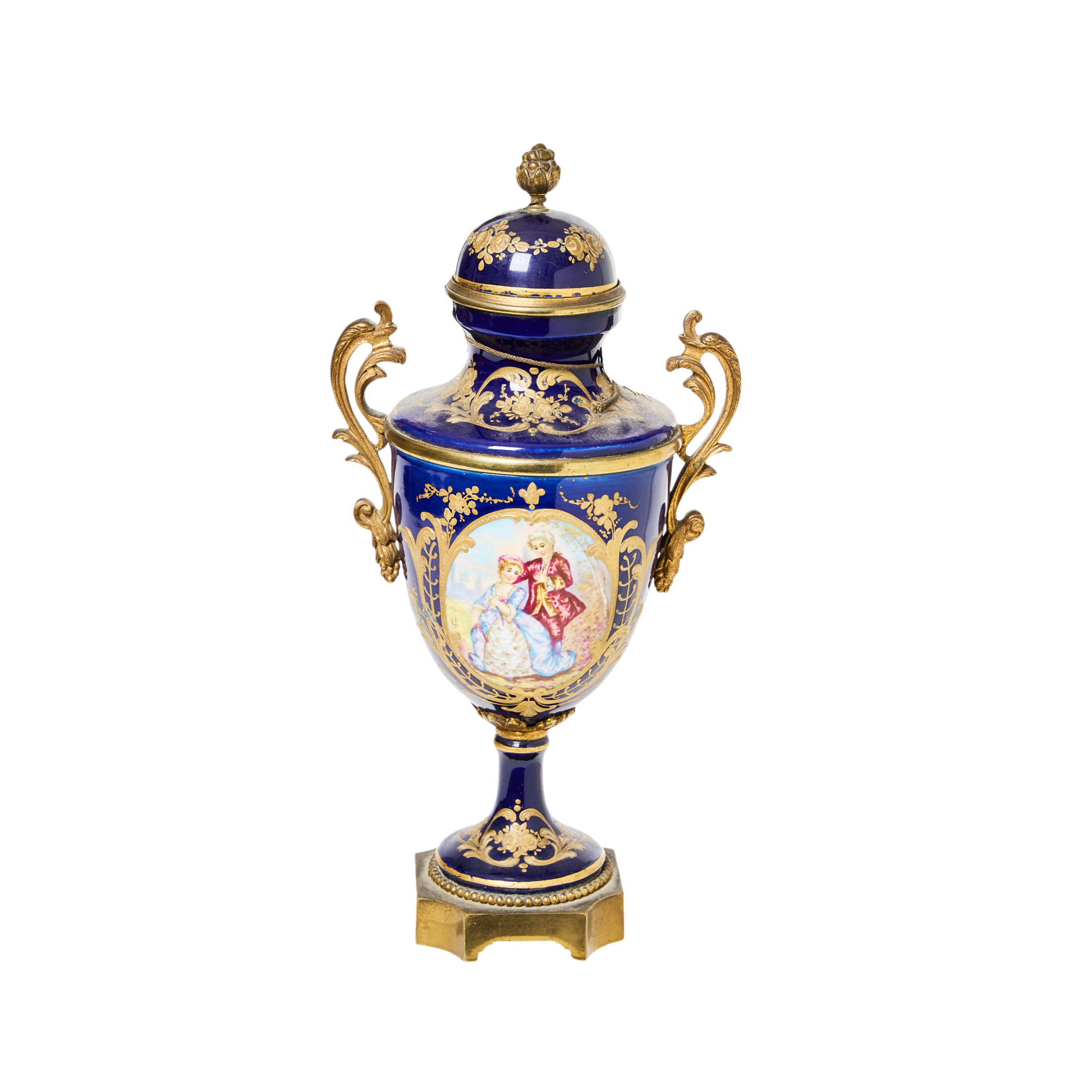 Pequeño jarrón con tapa en porcelana francesa de Sèvres con escena paisajistica y de cortejo en cartelas sobre fondo azul cobalto y con realces en dorado, primera mitad s.XX. Montura y copete en bronce dorado. Presenta sello en la tapa.