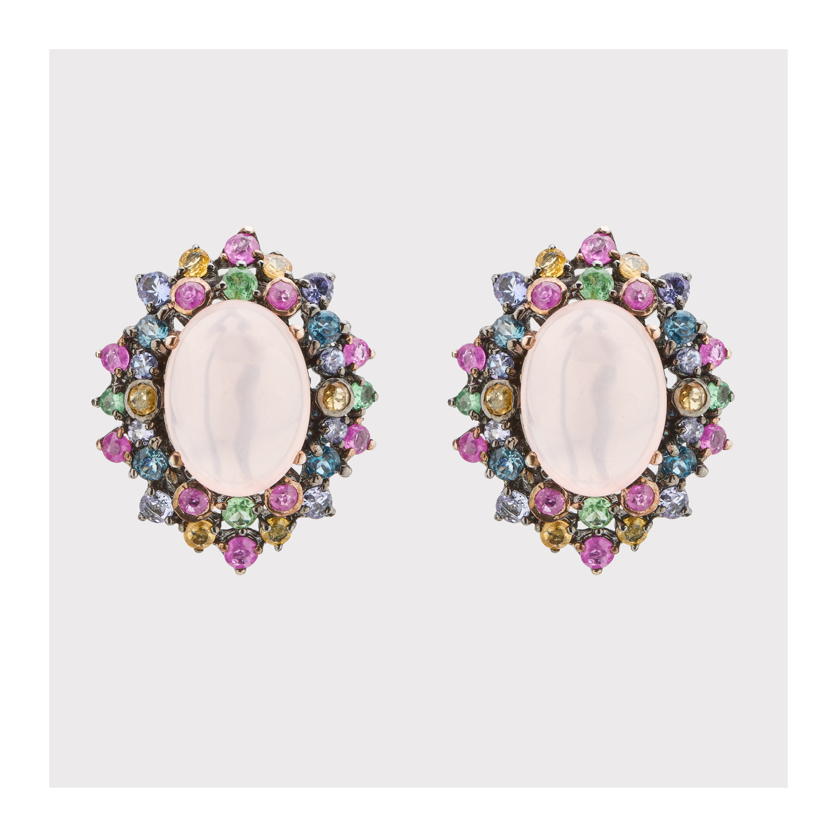 Pendientes en plata pavonada con cabujón de cuarzo rosa de 17 x 12 mm, iolitas y zafiros multicolor talla redonda engastados en garras. Estimación:400 – 550€