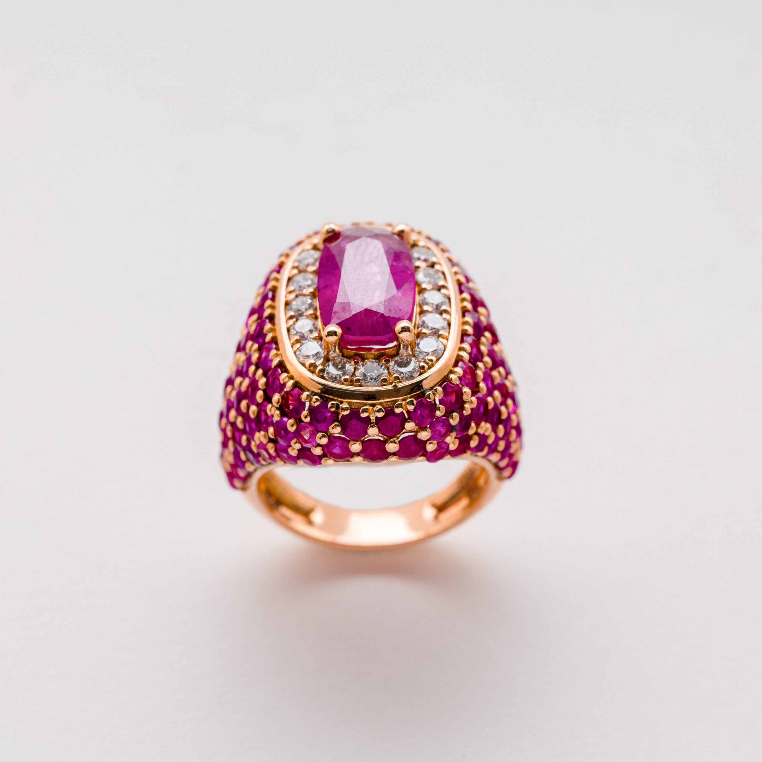 Sortija diseño sello en oro con cuerpo cuajado de rubíes talla redonda y rosetón central de rubí de Myanmar (Burma-Mogok) talla cojín orlado por diamantes talla brillante.