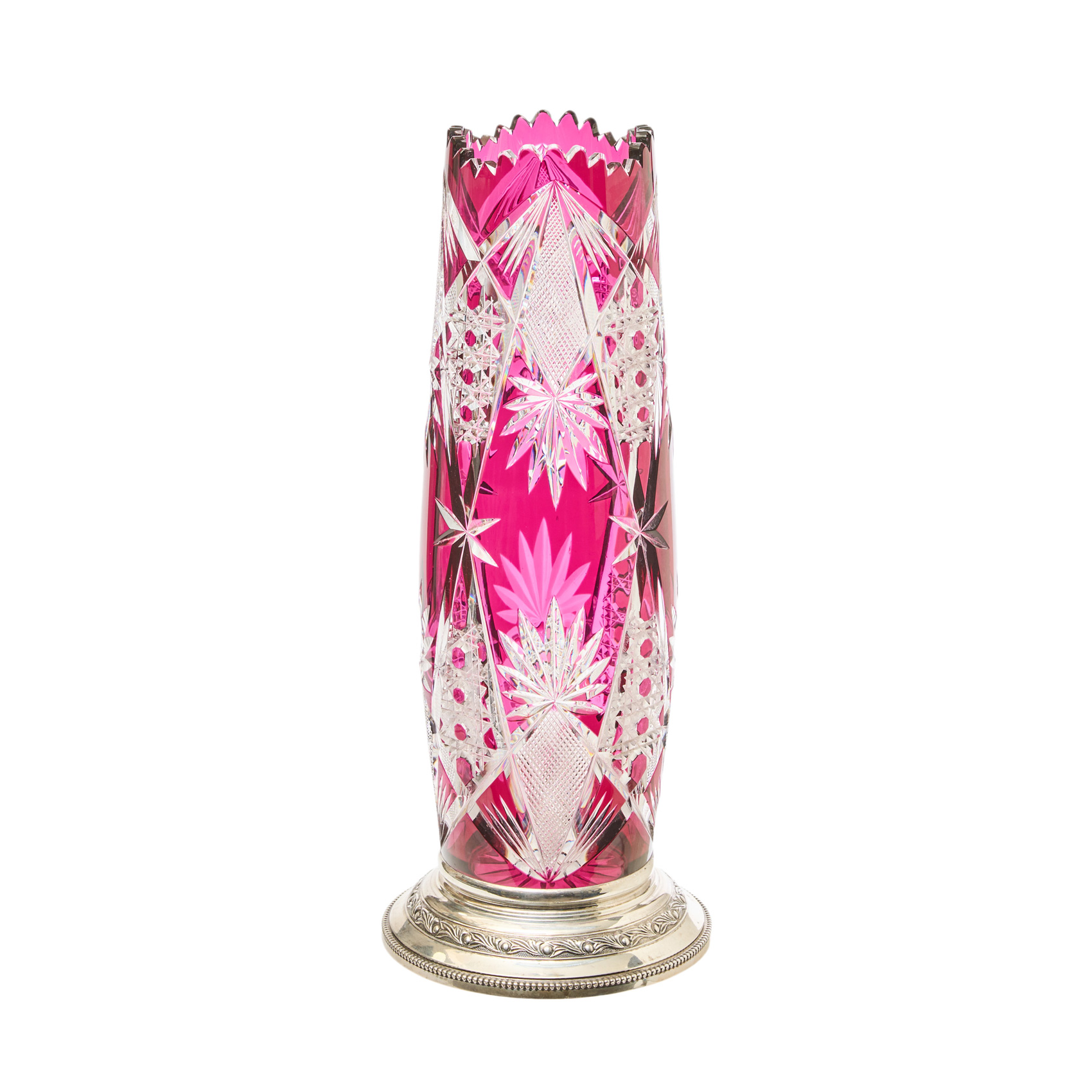 Jarrón en cristal francés tallado y doblado de tonalidades translúcida y burdeos con decoración de motivos geométricos, mediados del s.XX. Pie en plata española punzonada.