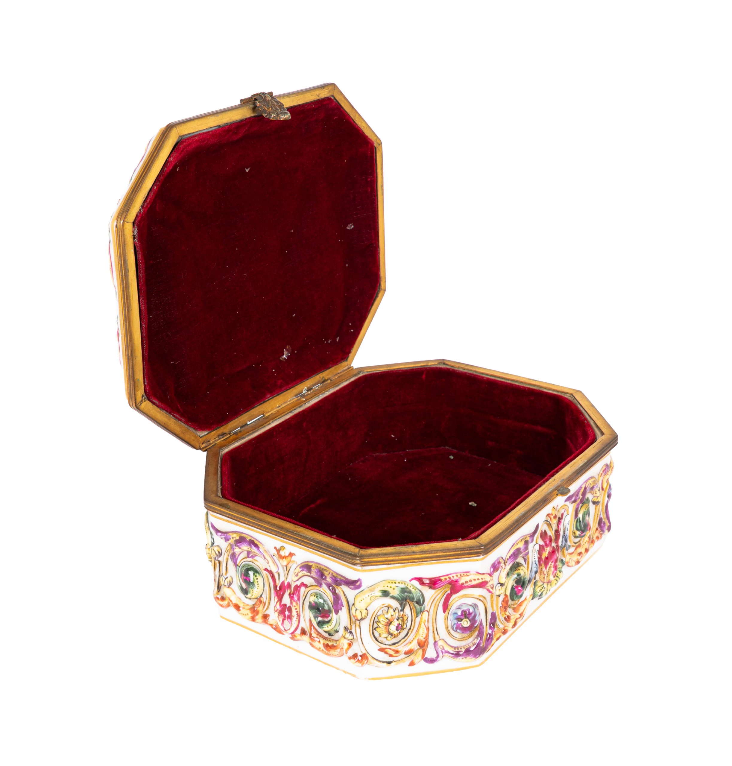 Caja en porcelana italiana de Capotimonte con decoración esmaltada en relieve de personajes clásicos, de guirnaldas y rocallas. Interior tapizado en terciopelo rojo. Marcas en la base.