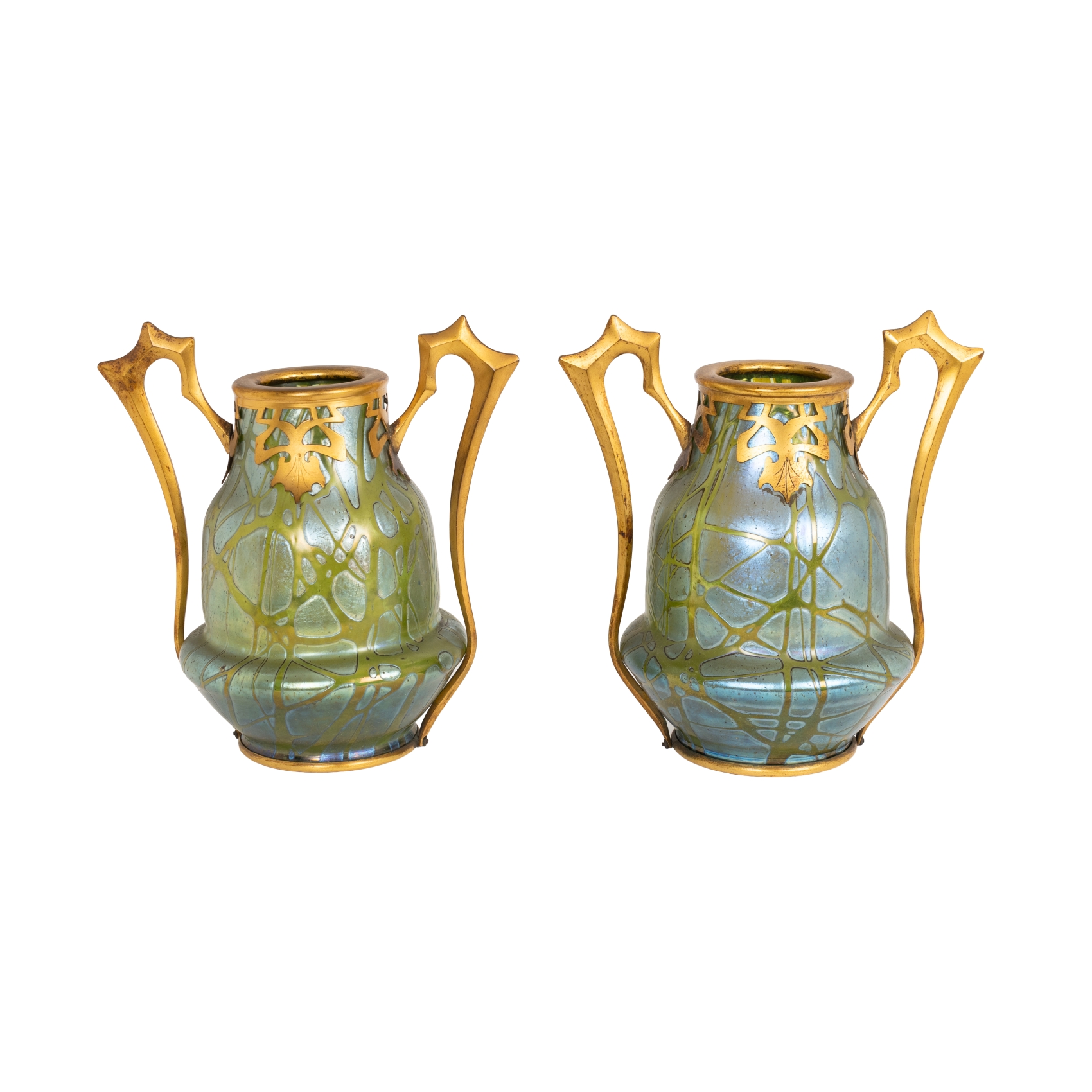 Pareja de jarrones en cristal austríaco iridiscente de tonalidades azul y verde con asas y detalles en metal dorado, c.1920. Siguiendo modelos de Loetz, Austria.