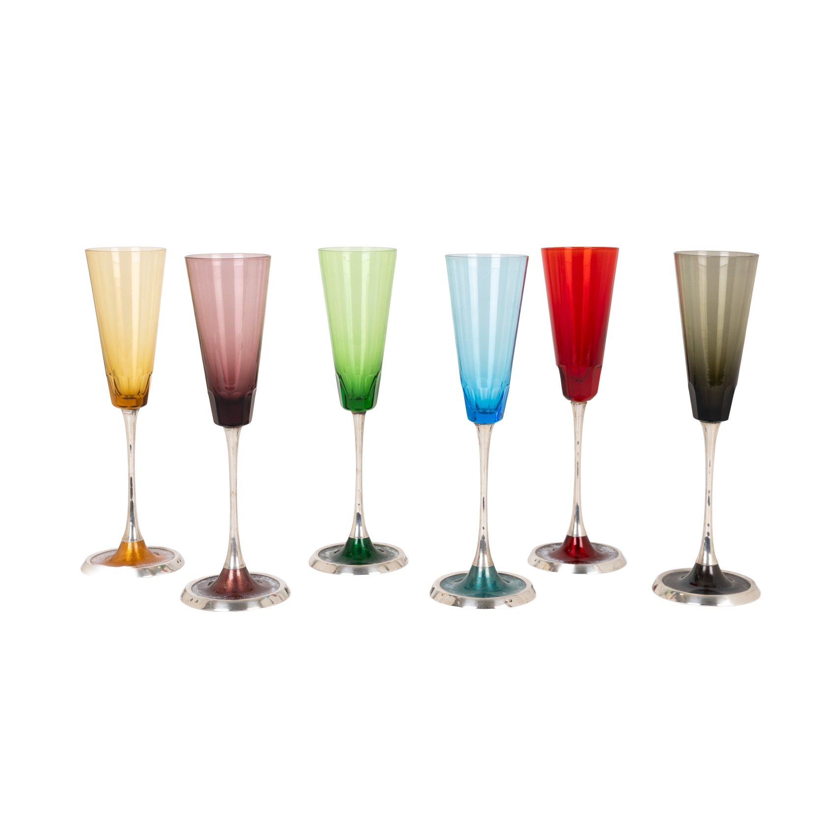 Juego de seis copas en cristal facetado en diversas tonalidades con pie en plata española punzonada y esmaltado moteado, c.1970-1980.