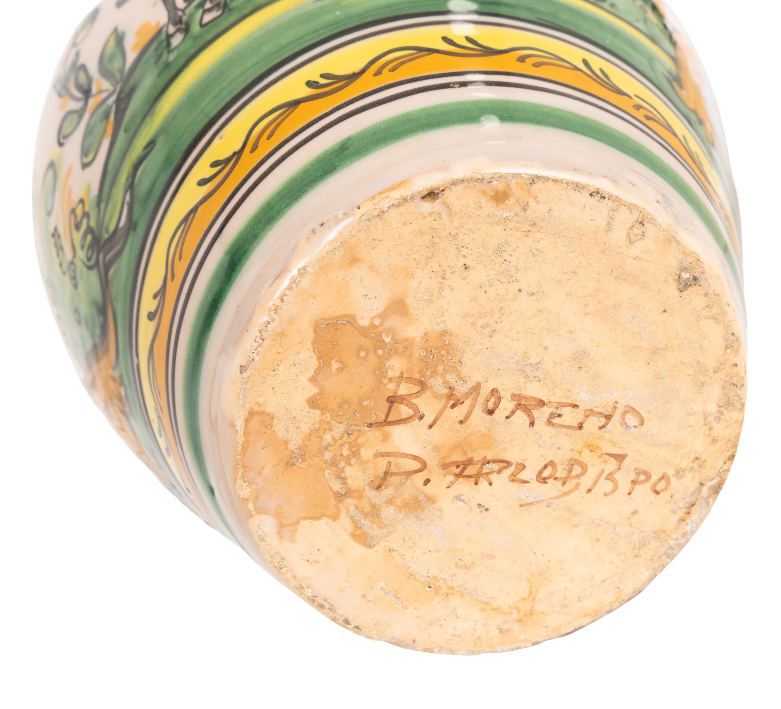 Jarra en cerámica esmaltada de «El Puente del Arzobispo», Toledo, con decoración de jinete sobre un brurro en el campo y cenefas florales, s.XX. Marcas en la base. Firmado B. Moreno.