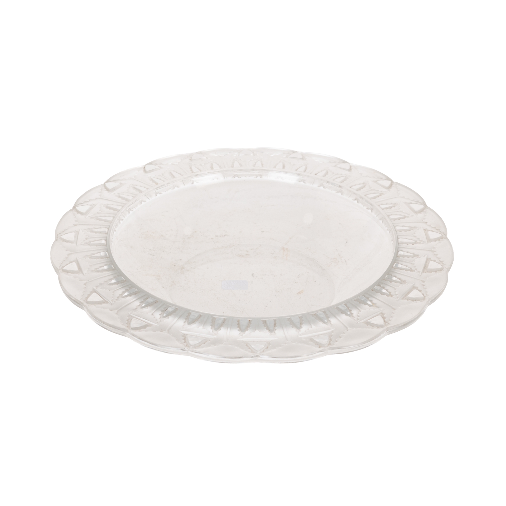 Centro en cristal francés de tonalidad translúcida parcialmente esmerilado con decoraciones perimetrales de motivos geométricos, c.1940-1950. Sin sellar.