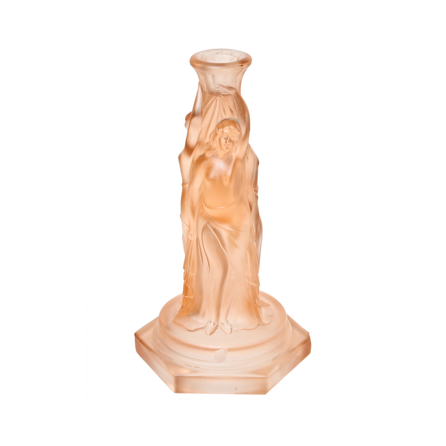 Candelero en cristal francés de estilo Lalique en tonalidad rosada con representación de las Tres Gracias en el fuste, s.XX.