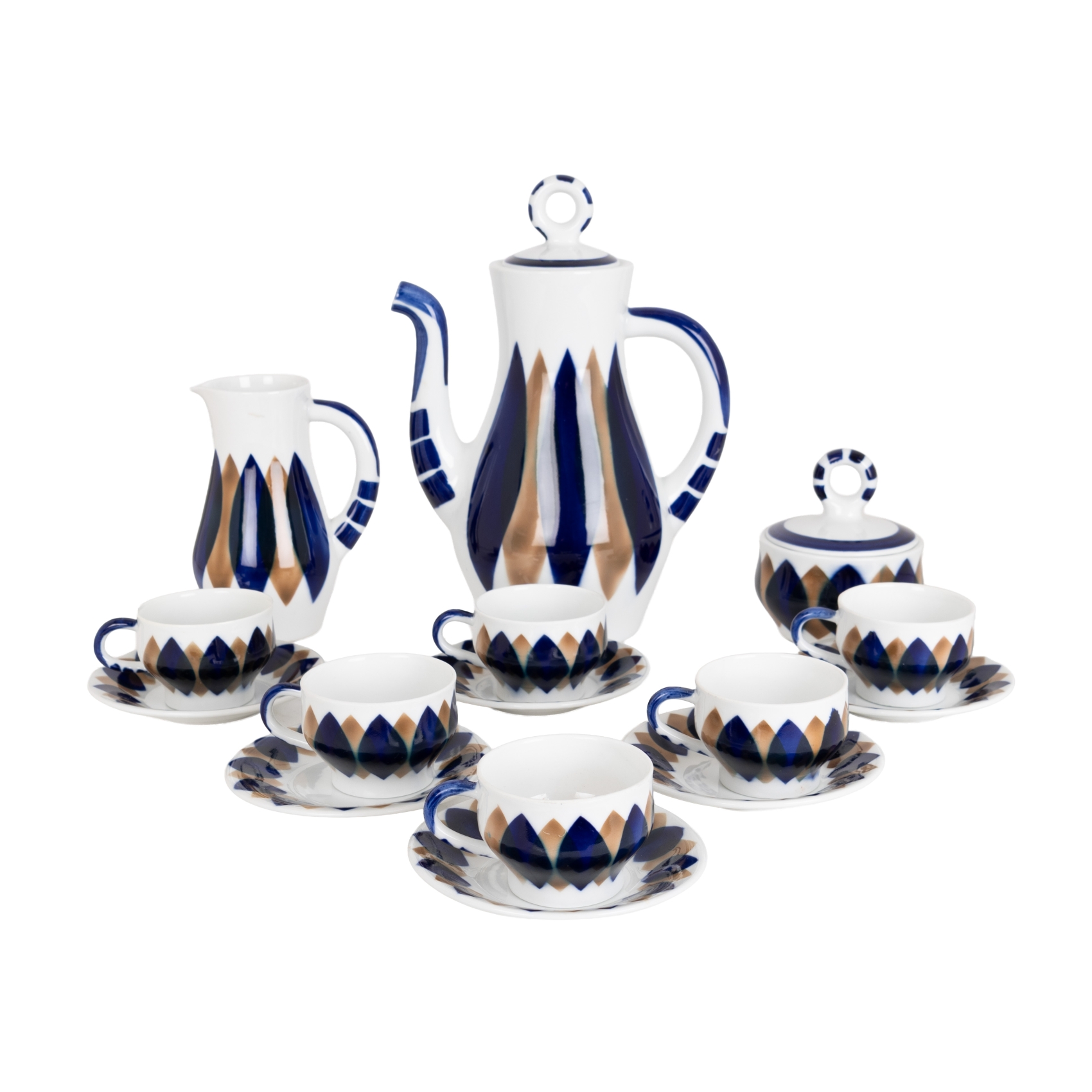 Juego de café modelo «Follas» en porcelana española esmaltada en tonalidades azules y marrones, s.XX. Compuesto por cafetera, lechera, azucarera, seis tazas y seis platitos. Marcas en la base.