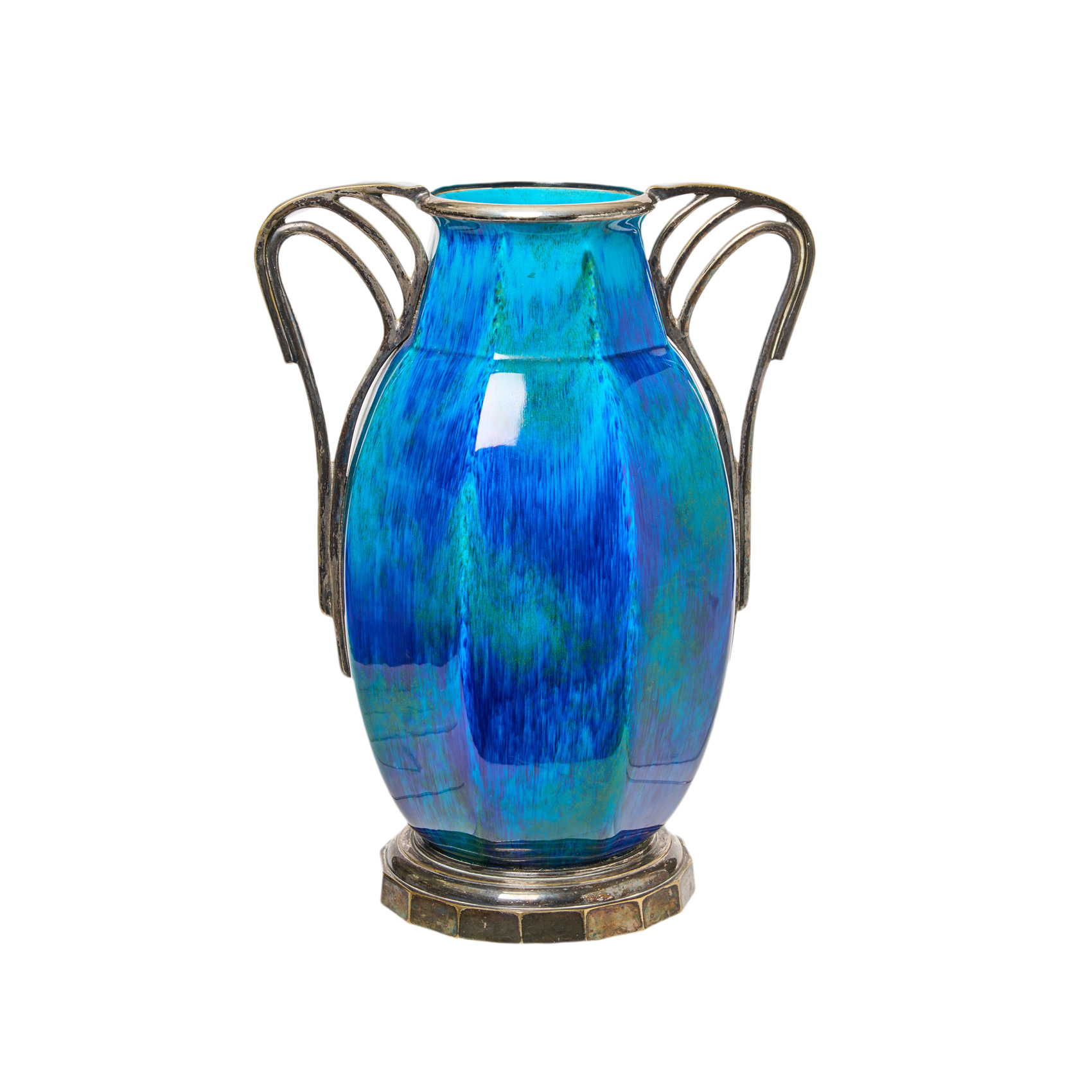 Jarrón francés Art Nouveau en porcelana francesa de Sèvres con esmalte azul al estilo de Paul Milet (1870-1950) y con montura en metal plateado, ppios. del s.XX. Marcas en la base y numerado 6371/71 en montura.