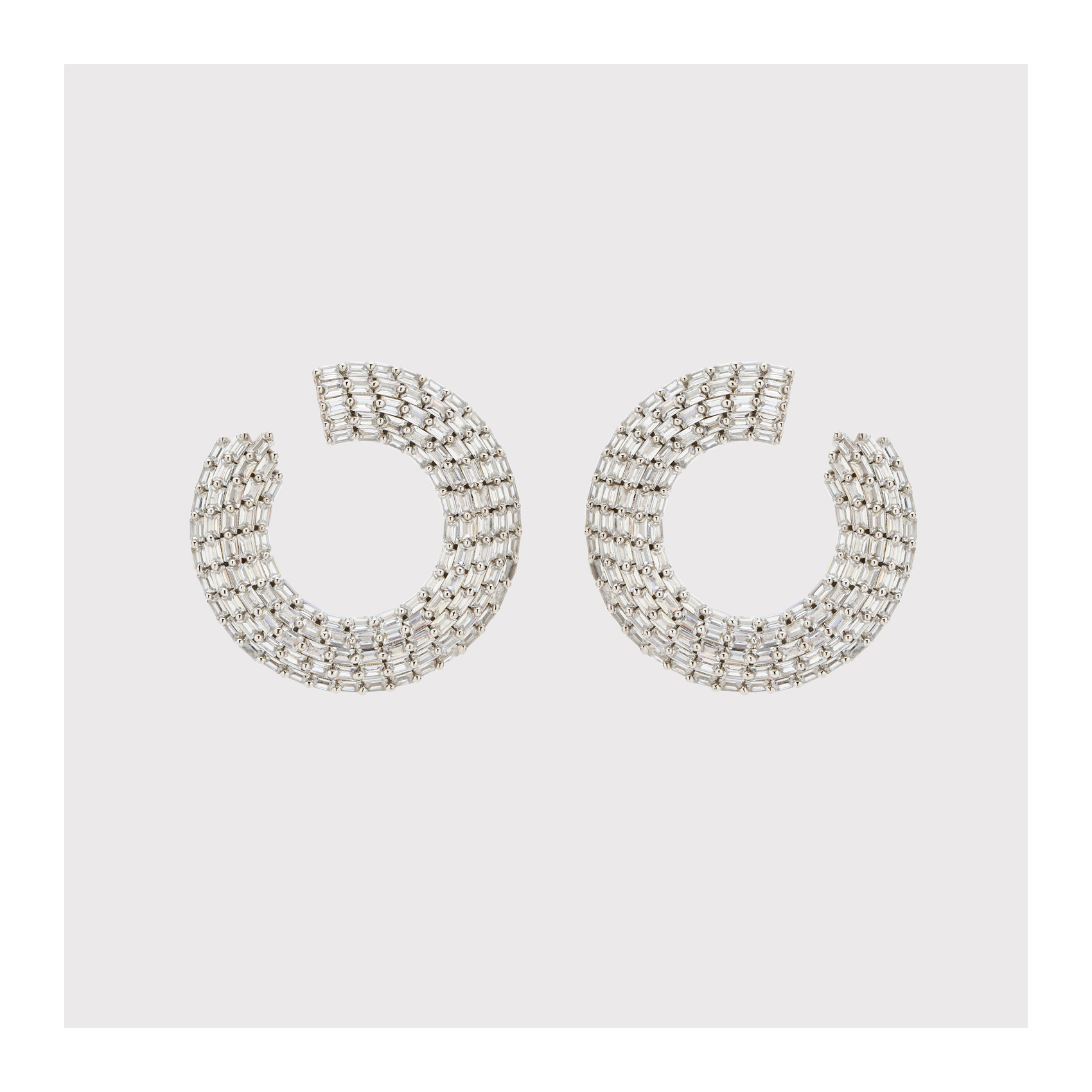 Pendientes diseño círculo abierto en plata rodiada cuajados de circonitas talla baguette.