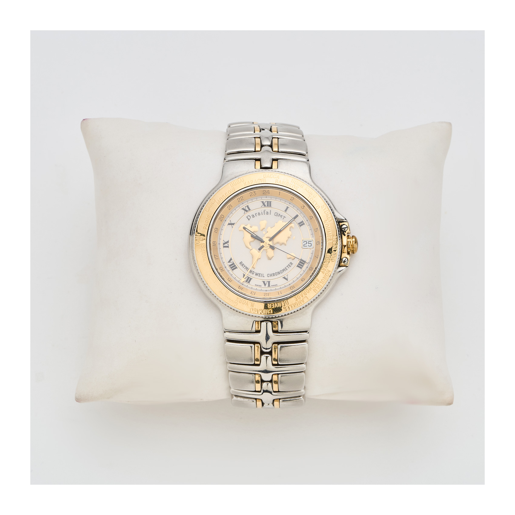 RAYMON WEIL «Parsifal GMT». Reloj de pulsera para caballero. En acero y oro. Ref. A717158/ 2990. Esfera blanca con numeración romana. Calendario fecha a las 3. Cierre desplegable. Maquinaria vista. Mecanismo automático.