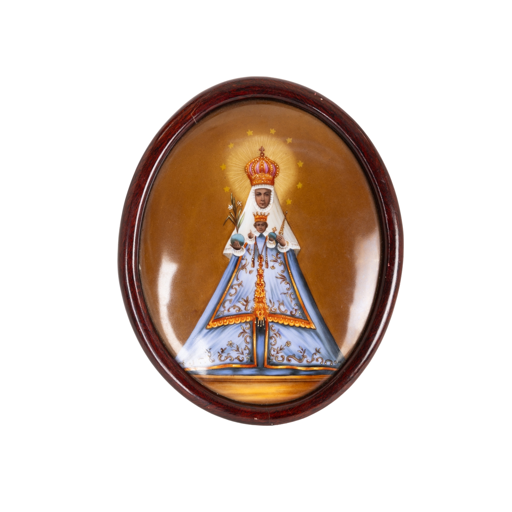 Placa en porcelana esmaltada con representación de Nuestra Señora de Aparecida, ppios. del s.XX. Enmarcada.
