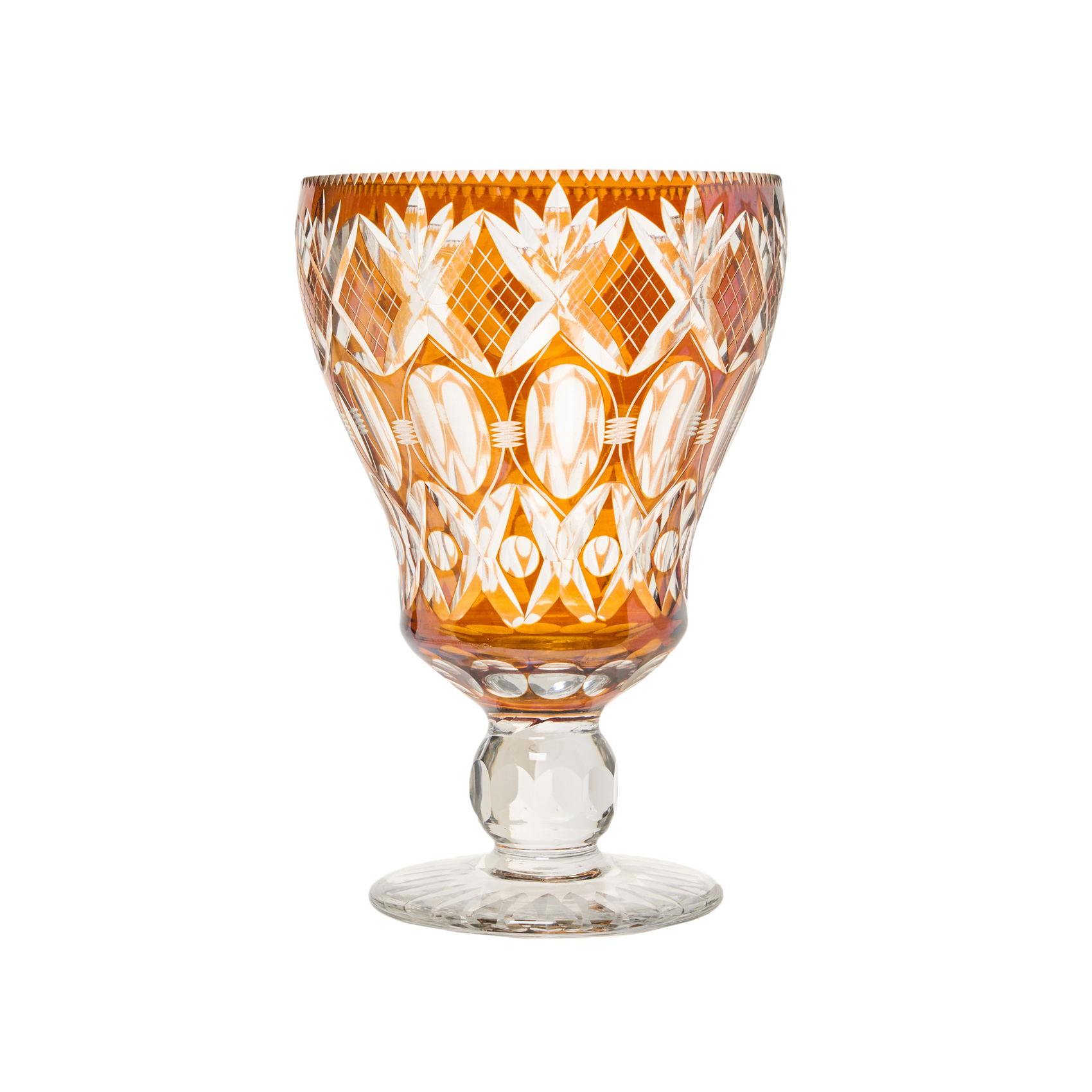 Jarrón diseño copa en cristal de Bohemia tallado y doblado de tonalidad translúcida y ámbar con decoración de motivos geométricos, s.XX.