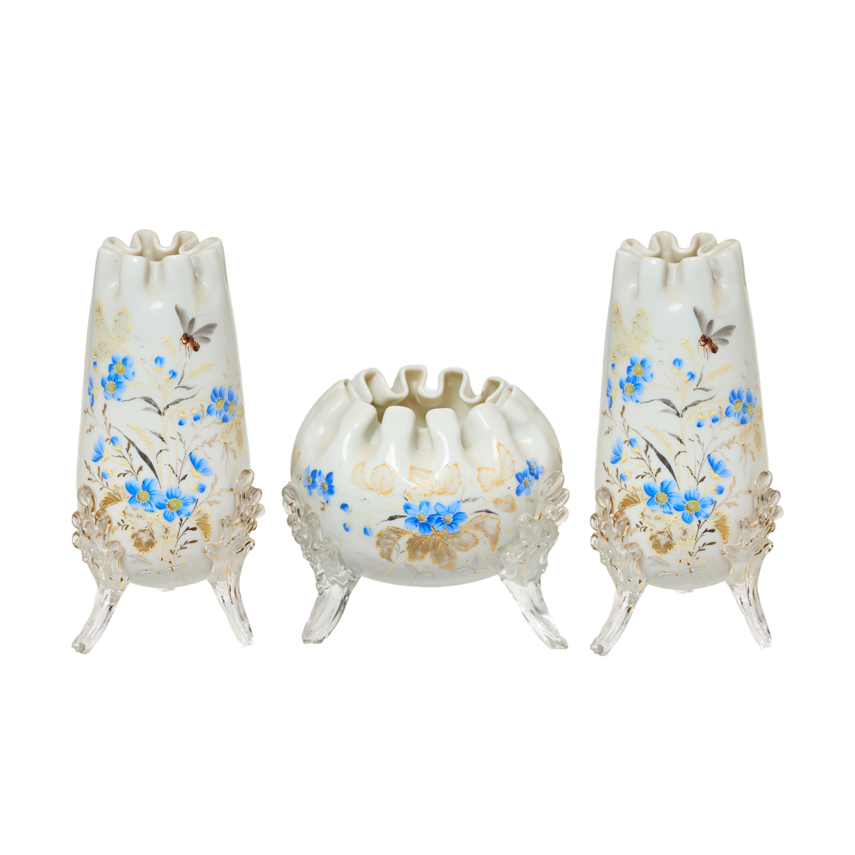 Tresillo en opalina de tonalidad blanca y translúcida compuesto por jarrones y centro con decoración esmaltada de motivos florales, vegetales, mariposas, fileteados en dorado y boca rizada, c.1900-1910.