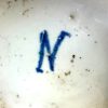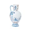 Jarra en porcelana alemana azul y blanca esmaltada con representación de escena rural con campesinos y mascarón. Marcas en la base.