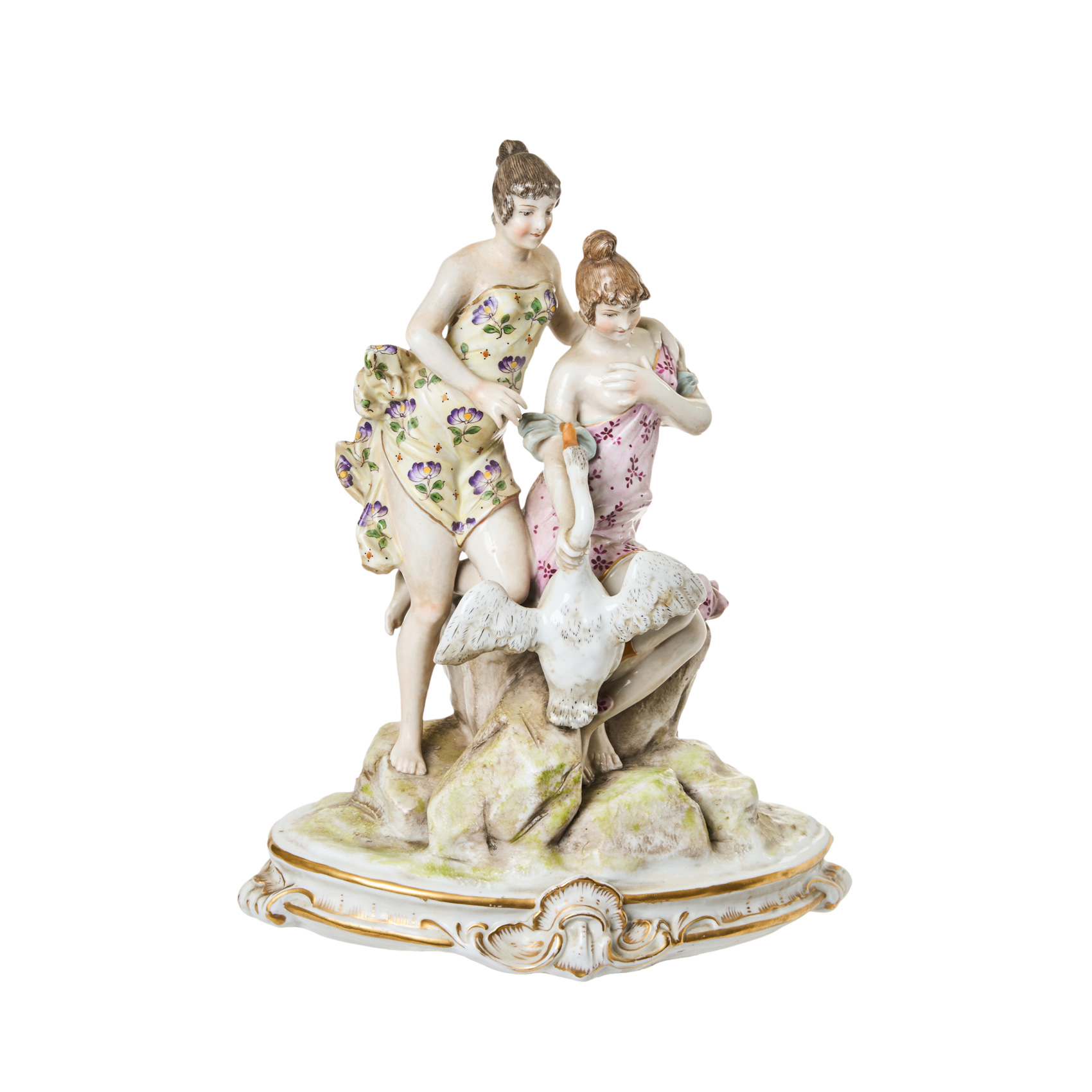 Grupo escultórico en porcelana alemana esmaltada con representación de pareja de figuras femeninas y cisne, fles. del s.XIX. Marcas en la base.