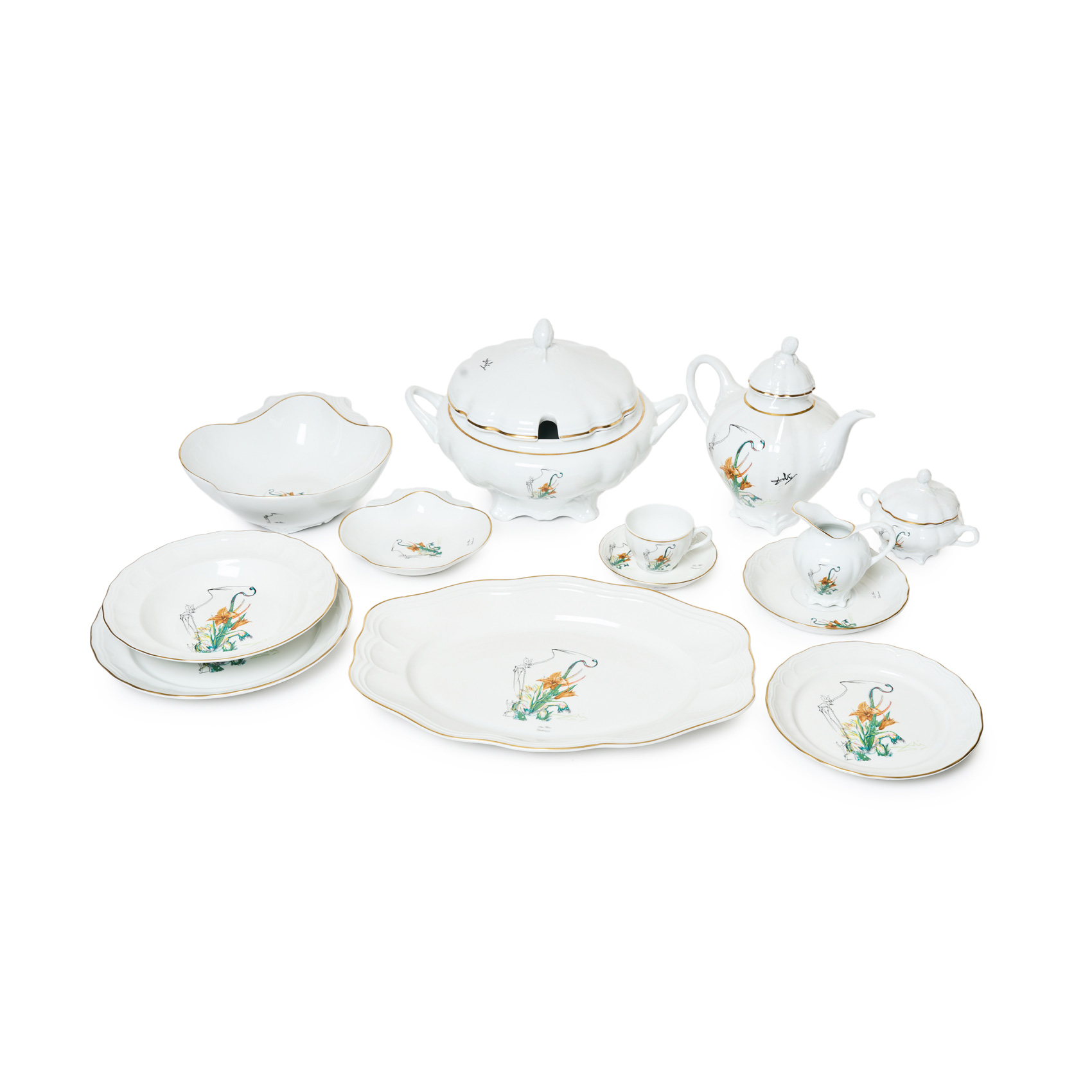 Vajilla de doce servicios de la serie «Las Flores Dalinianas» modelo «Hyppeastrum Elephantus» diseñada en 1981. 84 piezas. Numero E/302 de una serie limitada de 1.000 ejemplares. Compuesta por veinticuatro platos llanos, doce platos hondos, doce platos de postre, tres bandejas ovales de diferentes tamaños, dos almendreros, una salsera con plato, una sopera, una ensaladera, doce tazas de café, doce platitos de café, una cafetera, una lechera y una azucarera. Adjunta certificado de autenticidad.