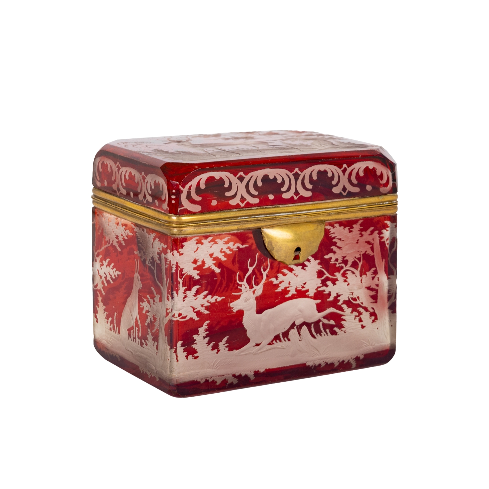 Caja en cristal de Bohemia doblado y tallado de tonalidad translúcida y roja con decoraciones animalísticas en paisajes, fles. del s.XIX. Sin llave.