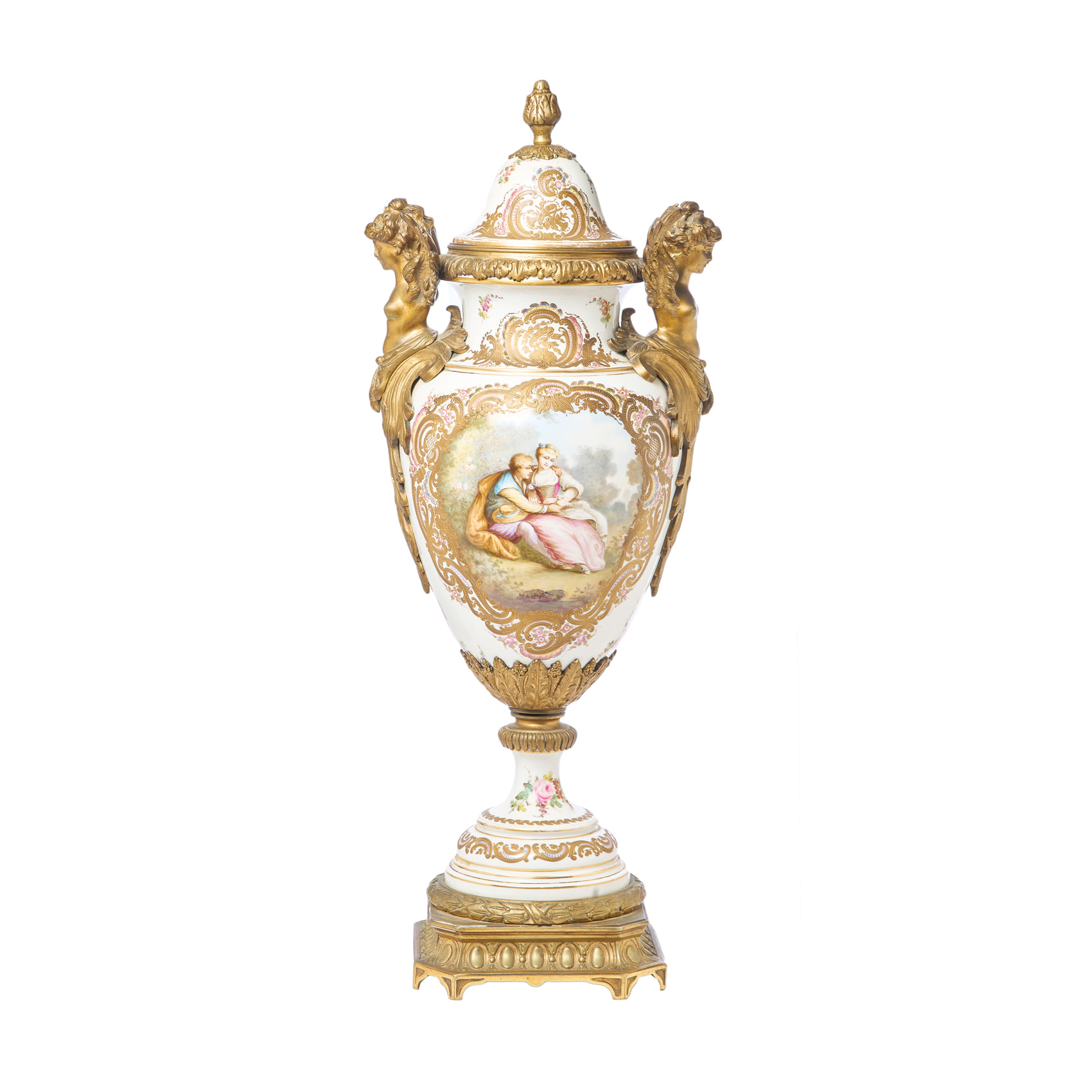 Jarrón en porcelana de Sevrès con decoración esmaltada de escenas paisajísticas y bucólico campestres en cartelas firmadas L. Bertran, fles. del s.XIX-ppios. del s.XX. Montura y remates en bronce dorado. Marcas en la tapa y la base.