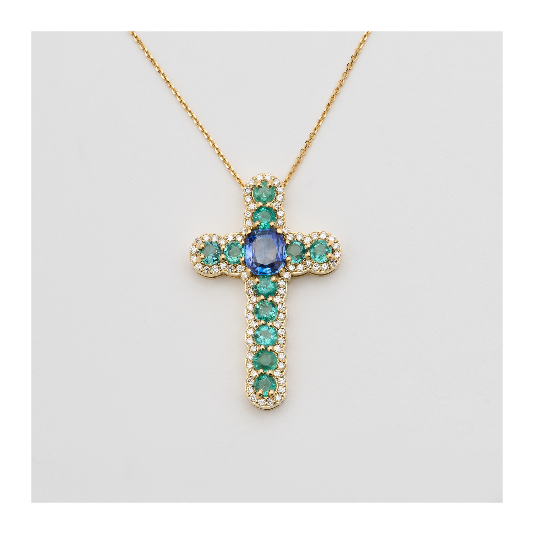 Cadena con colgante diseño cruz en oro, diamantes talla brillante, esmeraldas talla redonda y zafiro azul talla cojín engastados en garras.