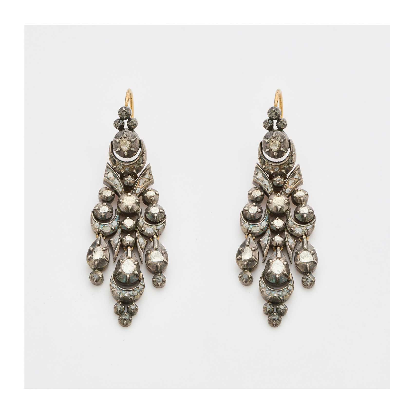 Pendientes largos isabelinos en plata y cierre en oro con diamantes talla rosa, tercer cuarto del s.XIX, 6 cm.