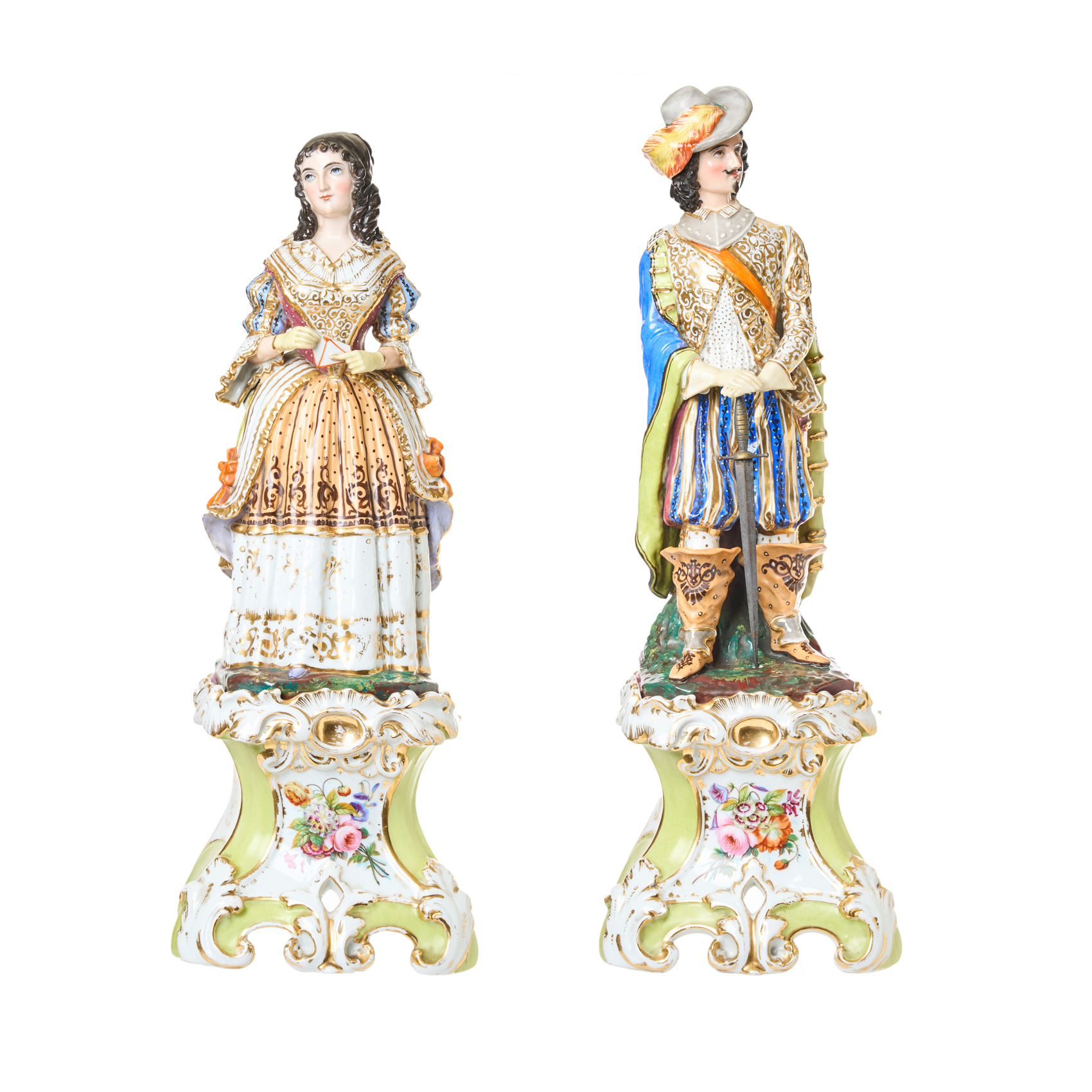 Pareja galante. Pareja de violeteros Viejo París en porcelana esmaltada y dorada, ppios. del s.XX. Apoyan sobre peanas en porcelana con decoración de motivos florales esmaltados y fileteados al oro fino.