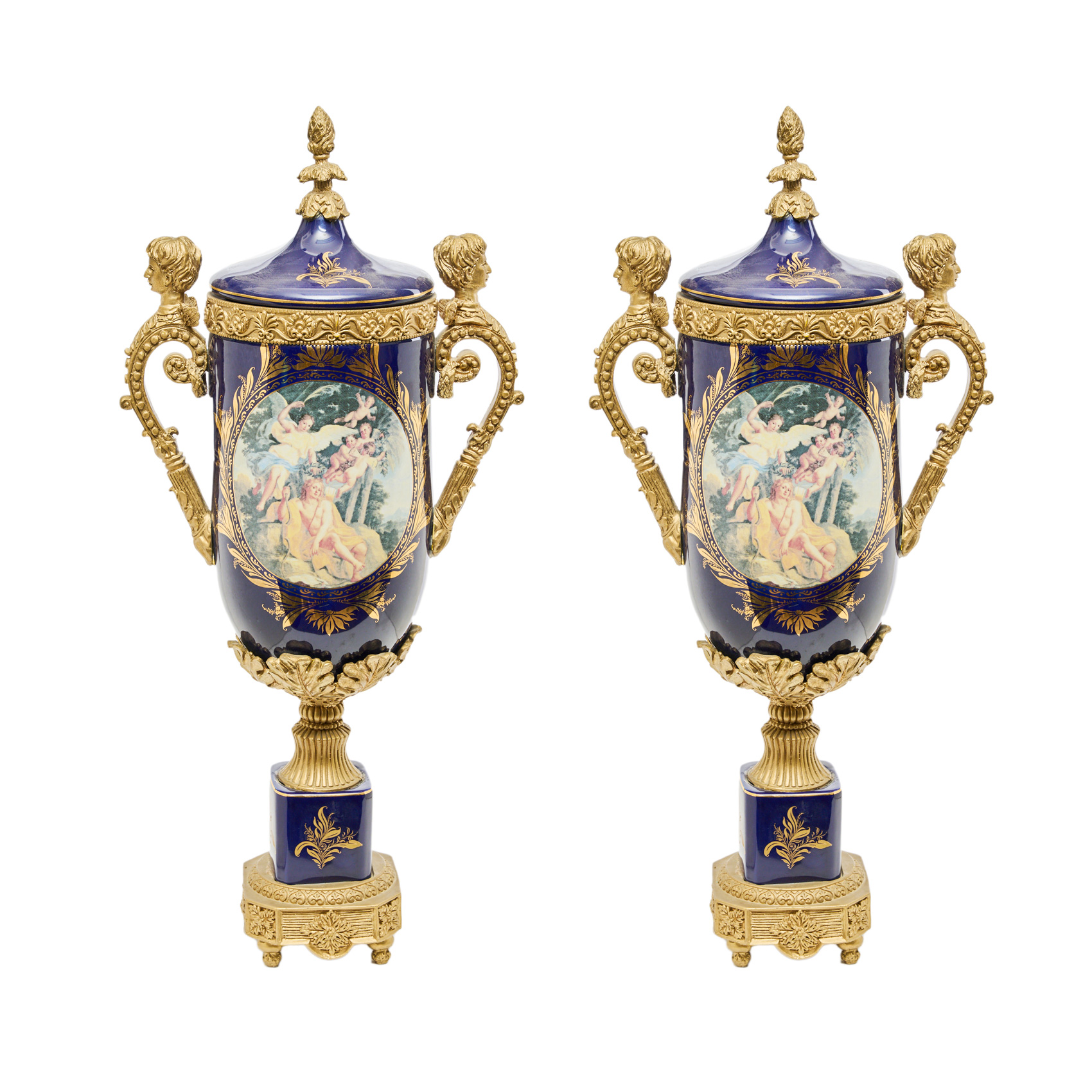 Pareja de jarrones con tapa estilo Sèvres en cerámica esmaltada con escenas mitológicas en reserva y realces en dorado, s.XX. Montura en resina dorada símil bronce.