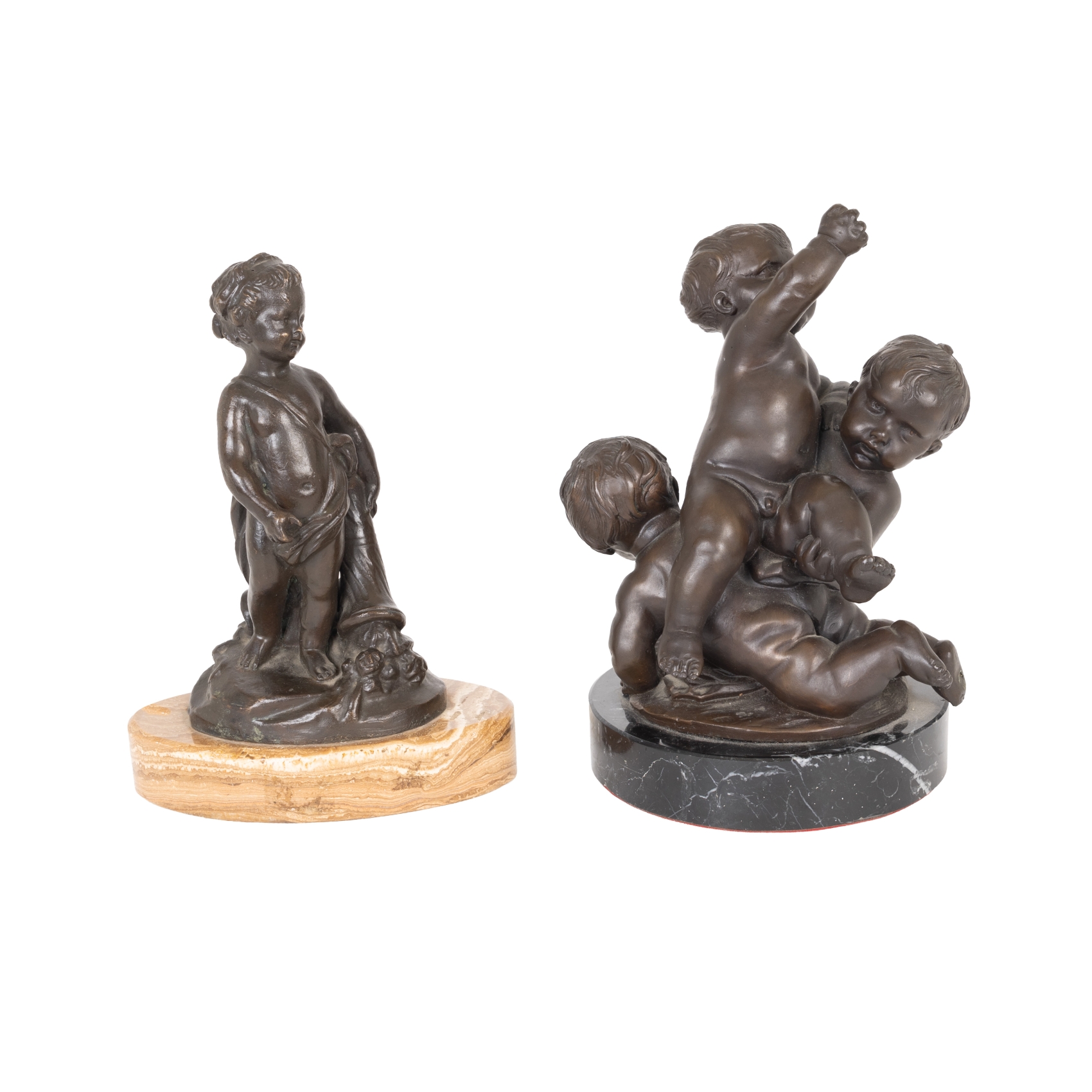 Pareja de esculturas en bronce patinado sobre peanas en mármol. Firmadas ilegible.
