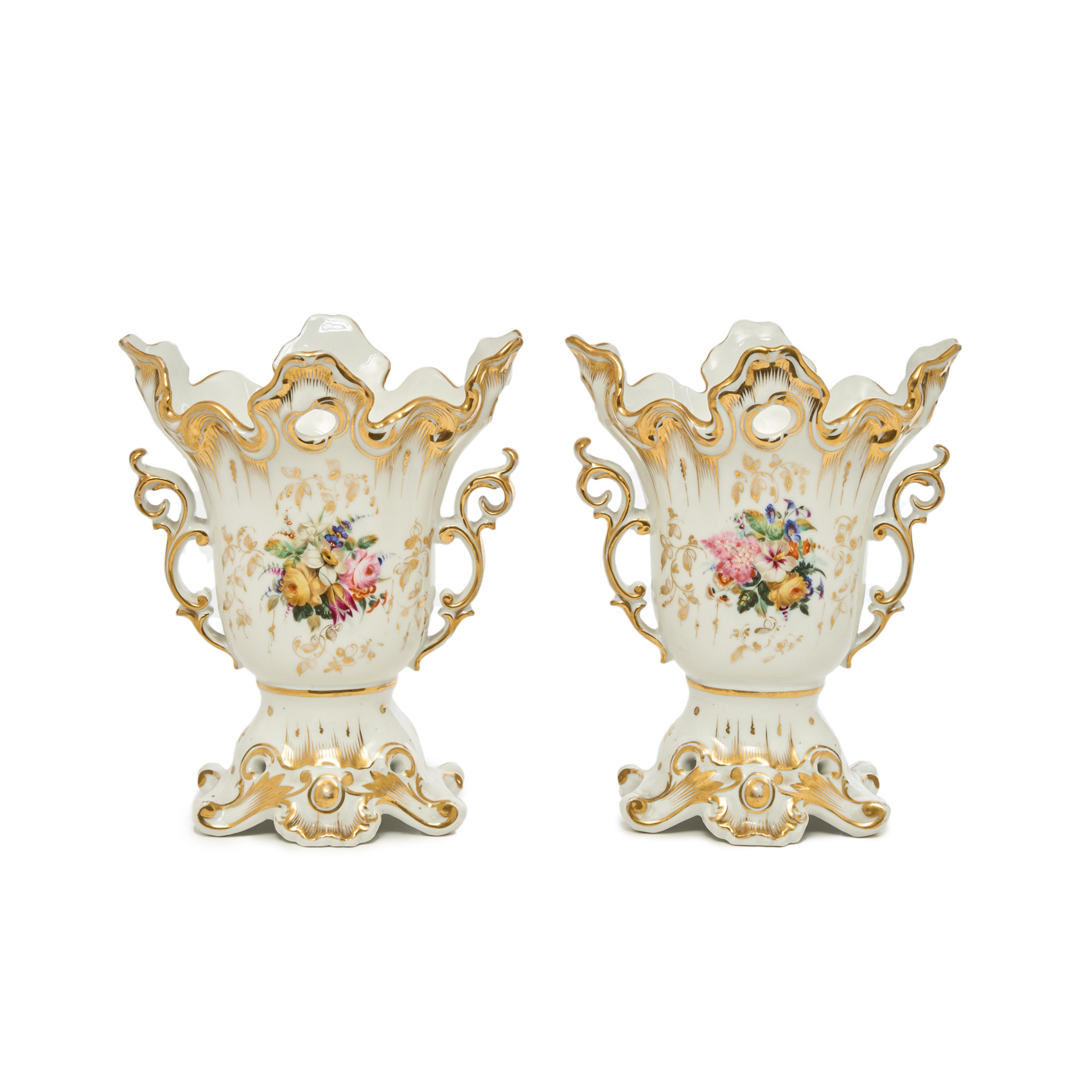 Pareja de jarrones isabelinos en porcelana esmaltada con decoraciones florales y realces en dorado, s.XIX.