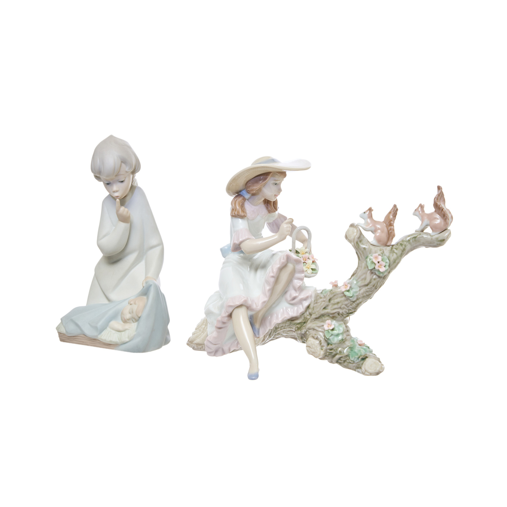 Ángel con niño y Niña con ardillas. Pareja de figuras en porcelana y biscuit esmaltadas.