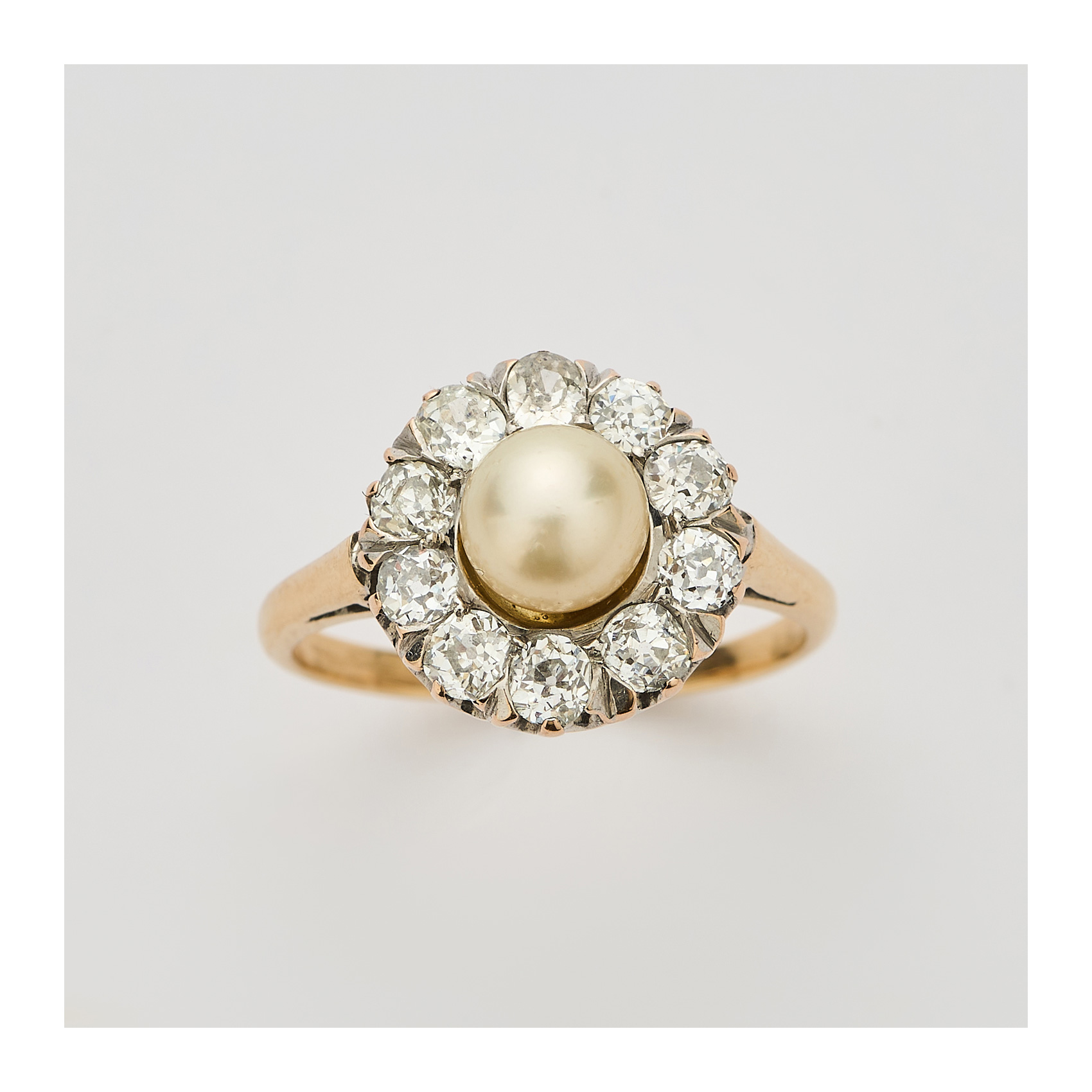 Sortija rosetón isabelino en oro y vistas en platino con perla cultivada de 6 mm. orlada por diamantes talla brillante antigua, tercer cuarto del s.XIX.