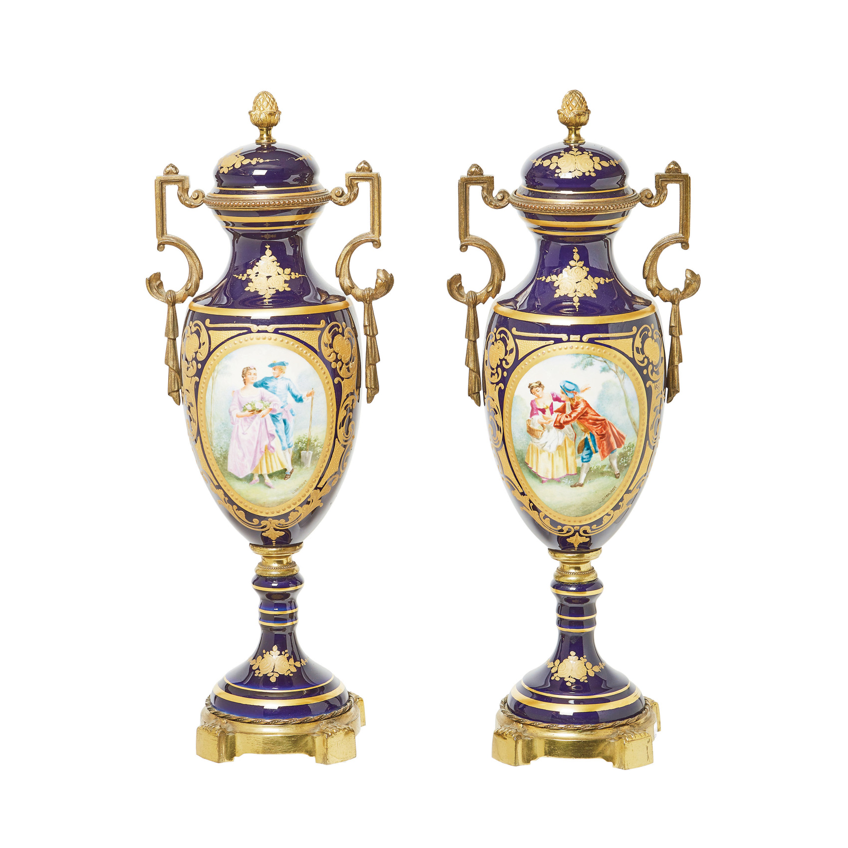 Pareja de jarrones en porcelana francesa tipo Sèvres con montura en bronce dorado, ppios. del s.XX. Cartelas con escenas galante y paisajísticas firmadas L. Daulmet sobre fondo azul cobalto y fileteados al oro fino. Marcas en la base.