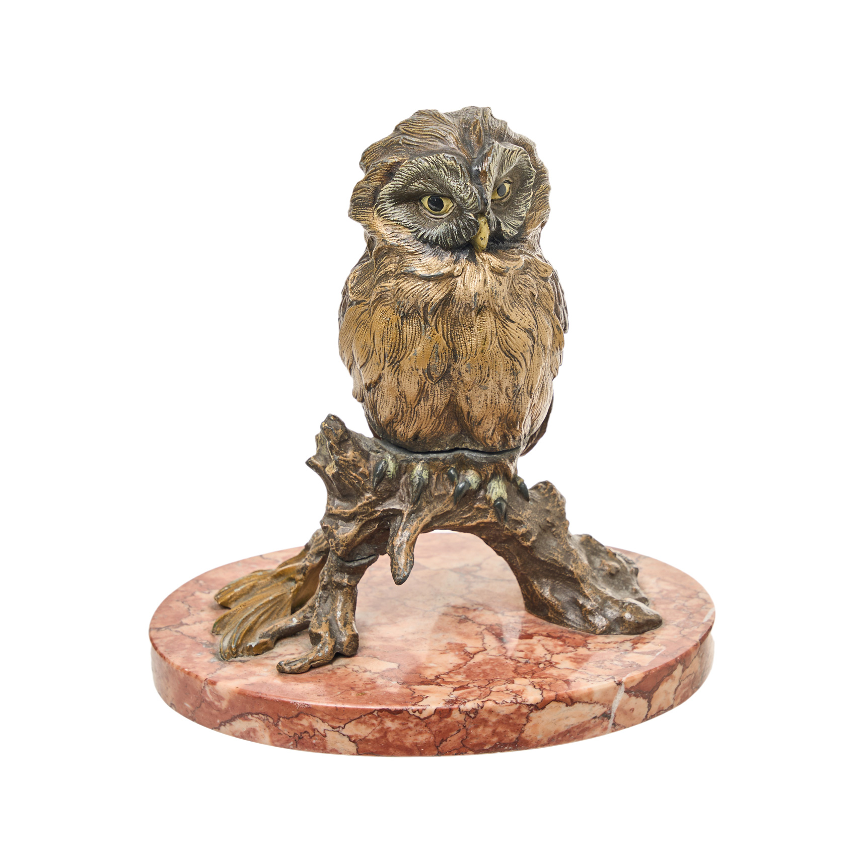 Escultura en bronce esmaltado sobre peana en mármol rojo veteado.