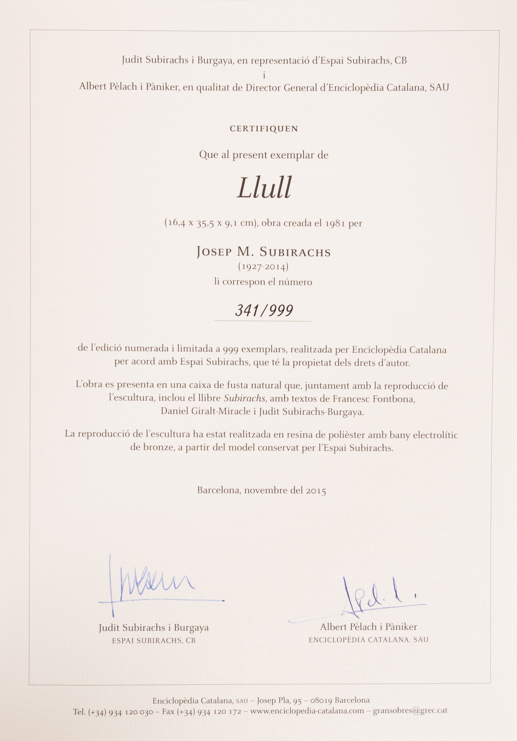 Escultura en resina y baño en bronce patinado. Numerada 341/999. Reproducción de la pieza original conservada en el Espai Subirachs. Adjunta libro de Subirachs, certificado de autenticidad y caja en original.