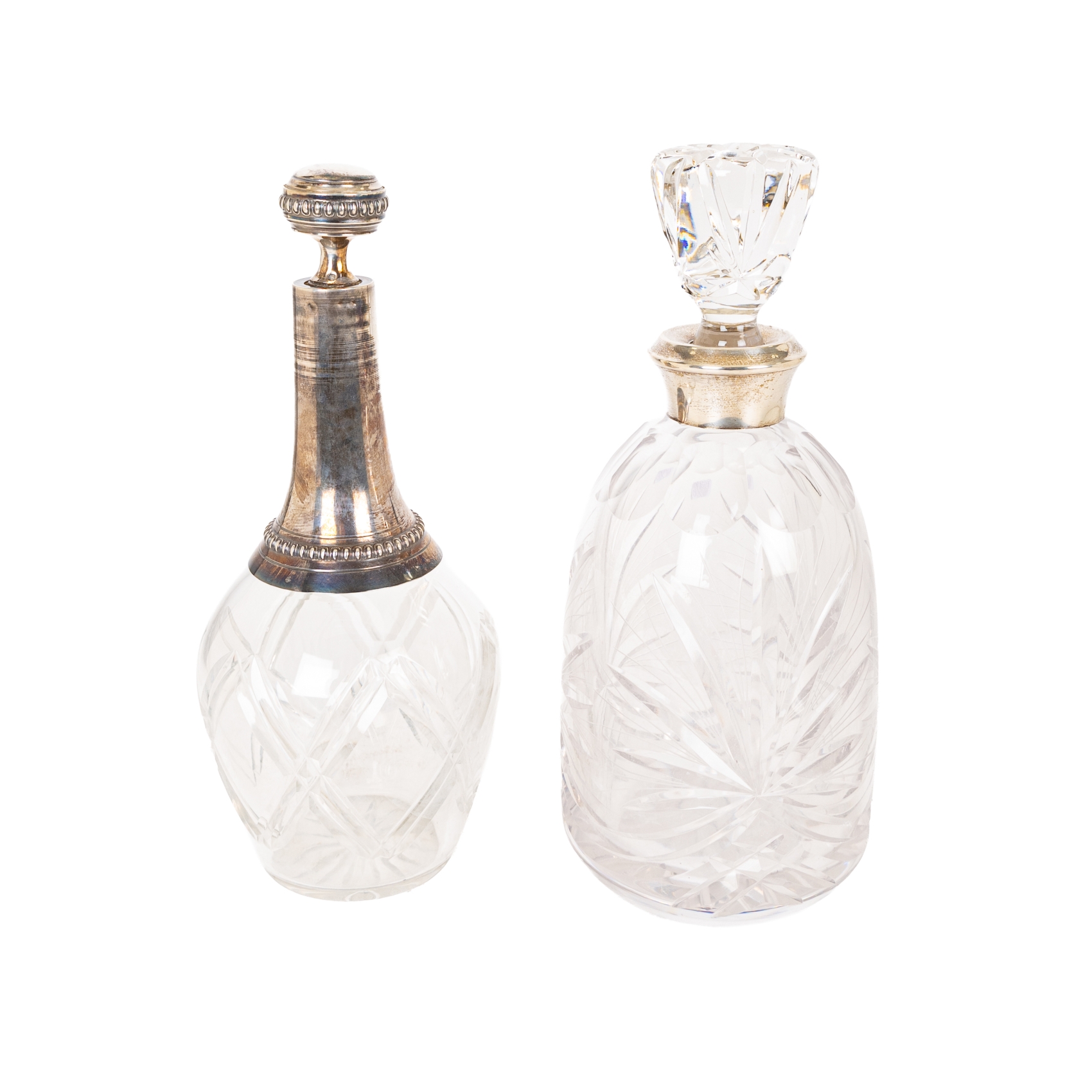 Pareja de licoreras en cristal tallado de tonalidad translúcido con decoraciones geométricas, s.XX. Golletes en plata punzonada.