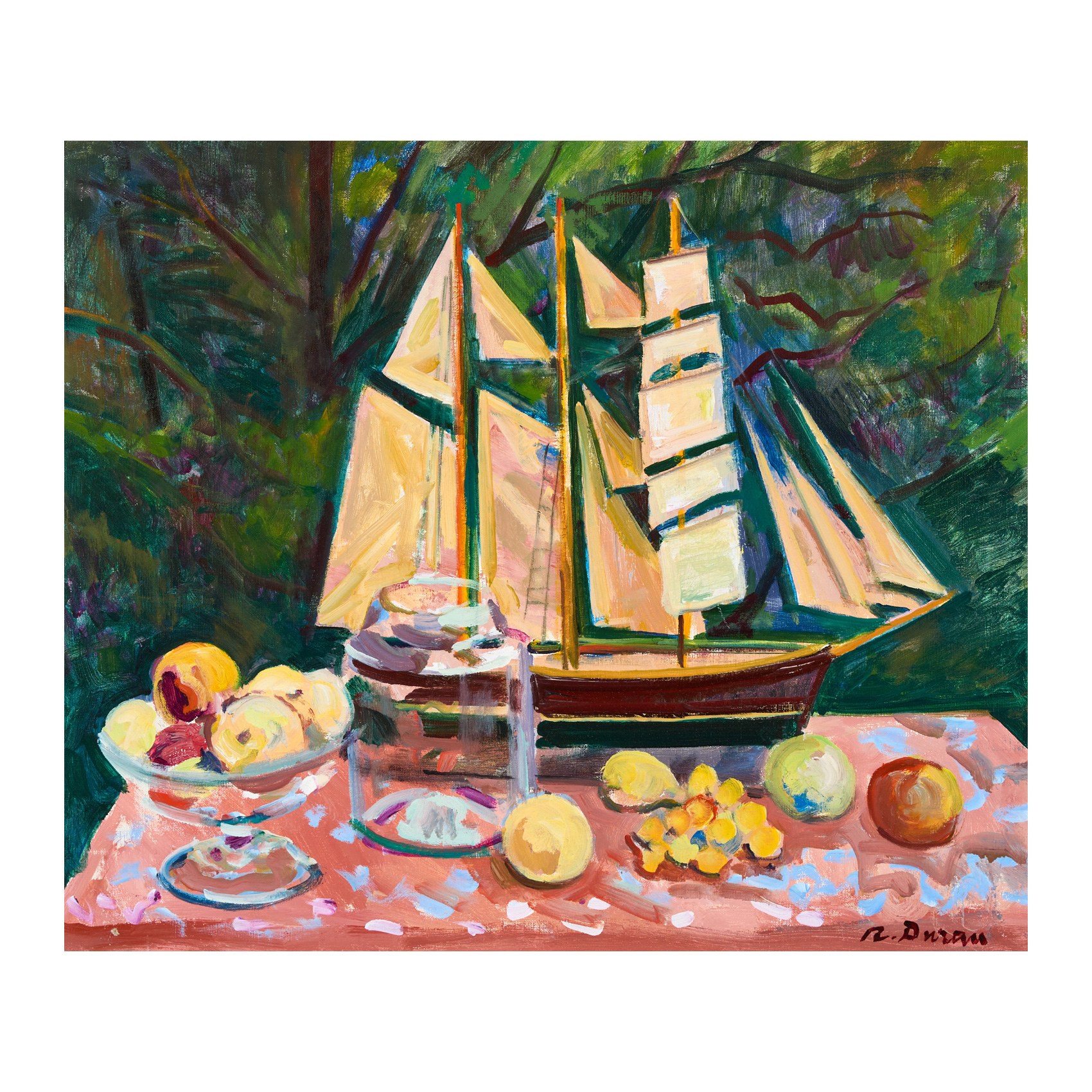 Bodegón de frutas con barco.